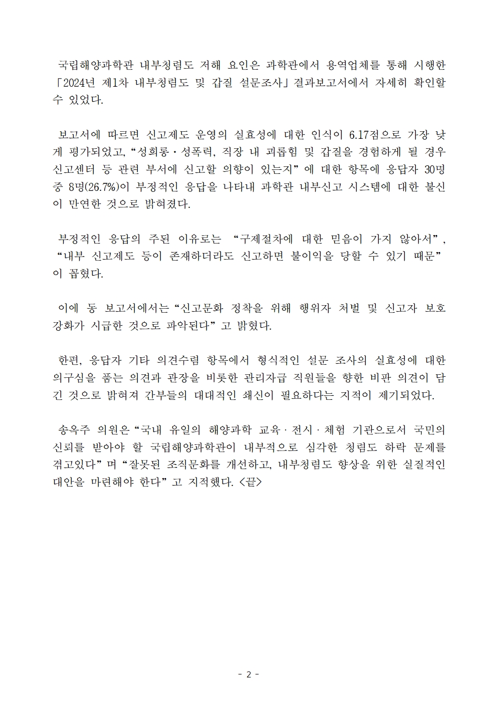 [국회의원 송옥주 국정감사 보도자료] 국립해양과학관, 해양수산부 산하 공공기관 내부청렴도 평가서 2년 연속 최하위