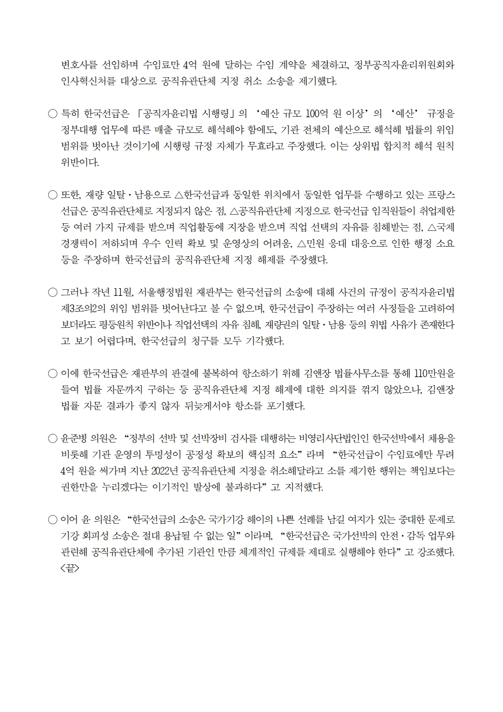 241021 [윤준병 의원 국정감사 보도자료] 한국선급 정부 상대로 공직유관단체에서 빼달라 소송했다 패소.hwp