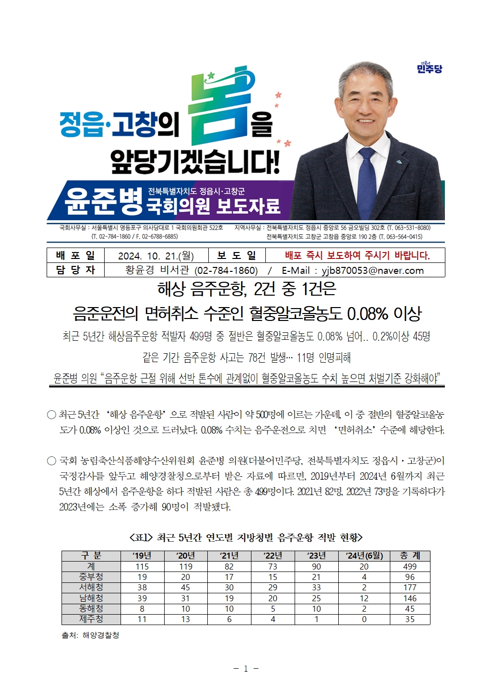 241021 [윤준병 의원 국정감사 보도자료] 해상음주운항 2건 중 1건은 음준운전의 면허취소 수준인 혈중 알코올 농도 0.08%이상 (1).hwp