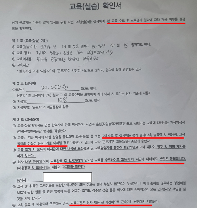 대표적인 콜센터 용역업체 ㈜트랜스코스모스코리아는 교육생들에게 ‘채용응시자의 교육 안내 확인서’를 받아 ‘실근무일수(영업일) 15일을 근무한 사람에게만 교육비 40,000원(식대 포함)를 지급한다’고 명시했다.
