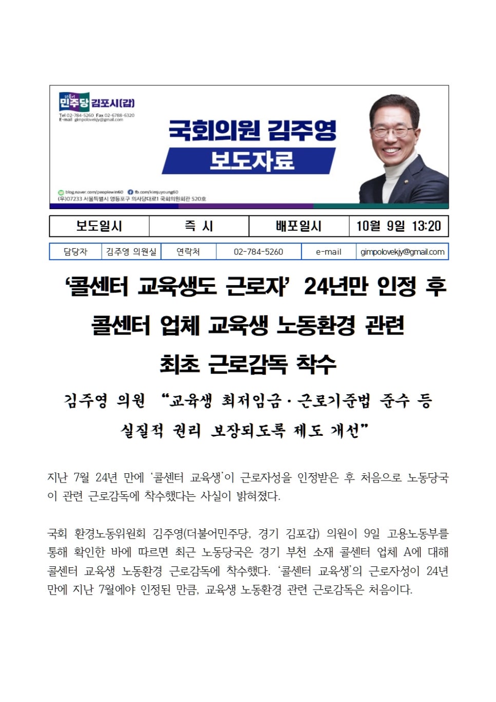 [국회의원 김주영] ‘콜센터 교육생도 근로자’ 24년만 인정 후, 콜센터 업체 교육생 노동환경 관련 "최초 근로감독 착수"