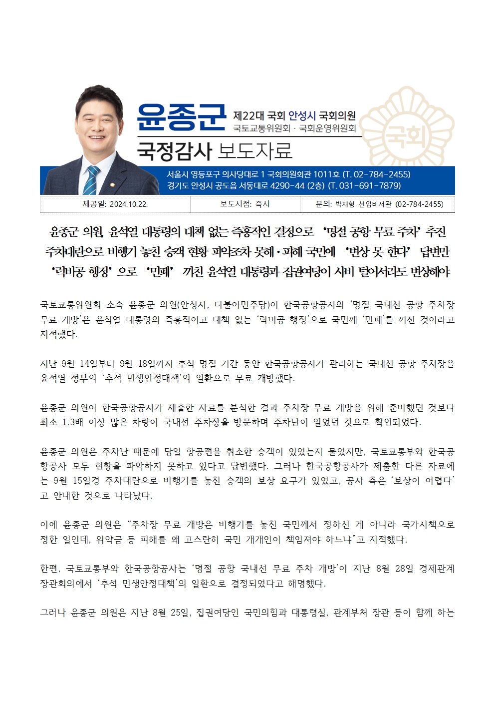 [국회의원 윤종군] 윤석열 대통령의 대책없는 즉흥적인 결정으로 ‘명절공항 무료주차’추진