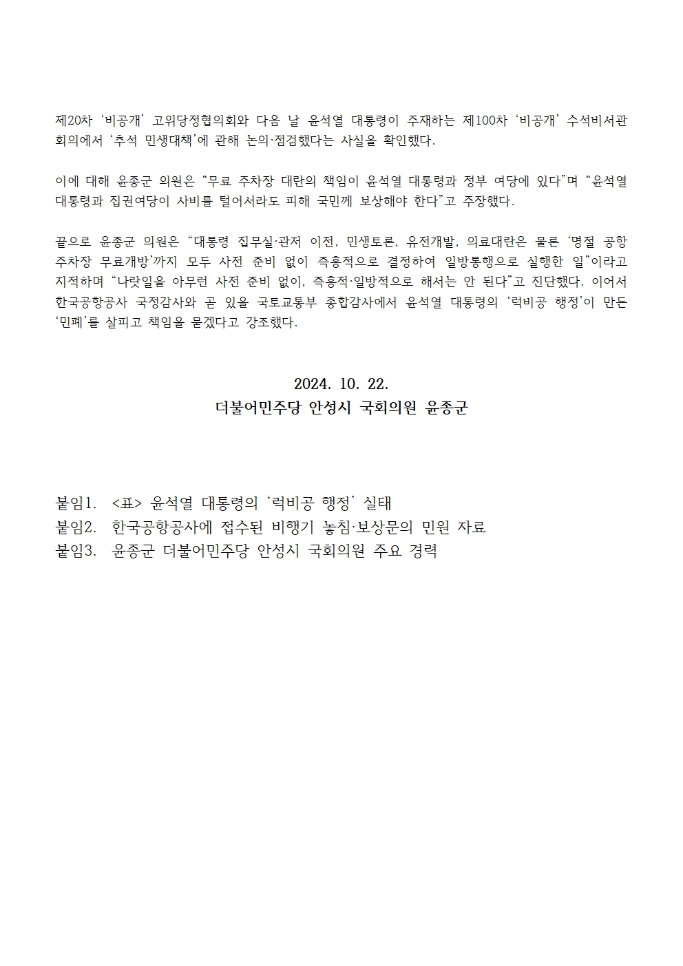 241022_윤석열 대통령의 대책없는 즉흥적인 결정으로 ‘명절공항 무료주차’추진.hwp