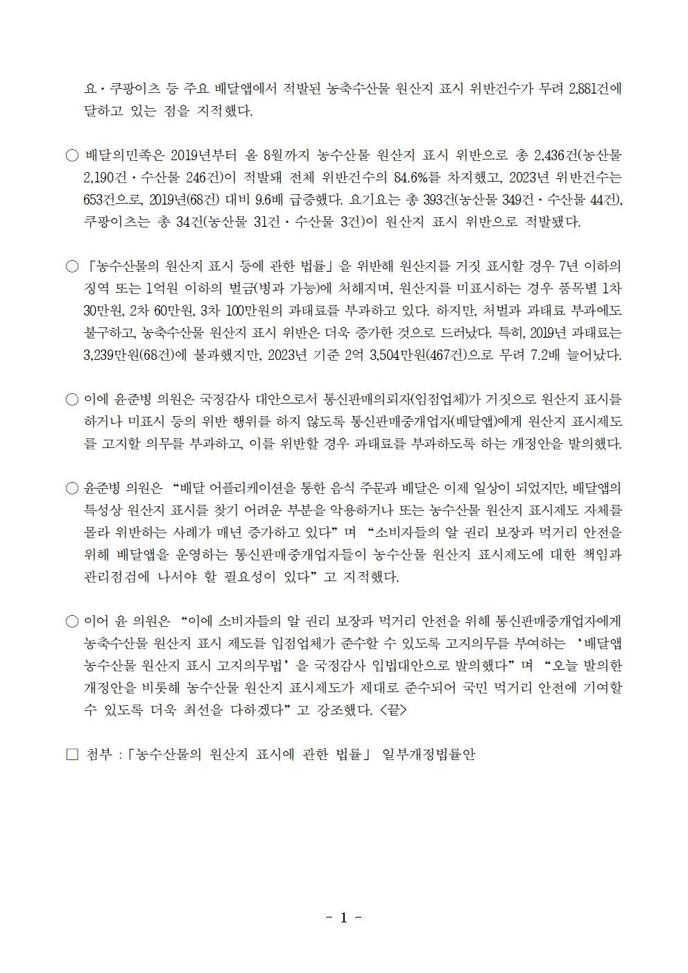 [윤준병 의원 국정감사 보도자료] 국정감사 대안 ‘배달앱 농수산물 원산지 표시 고지의무법’ 발의