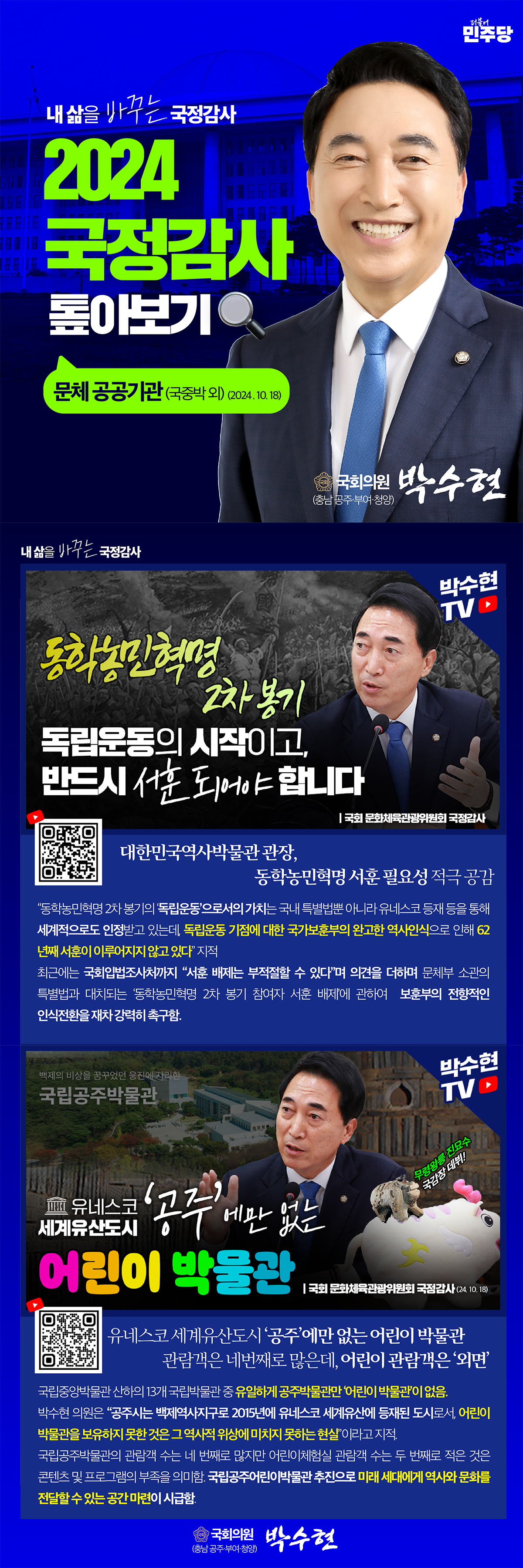 [박수현국회의원카드뉴스] 2024 국정감사 톺아보기 | 문화체육관광부 공공기관 및 유관기관 (국중박 외)