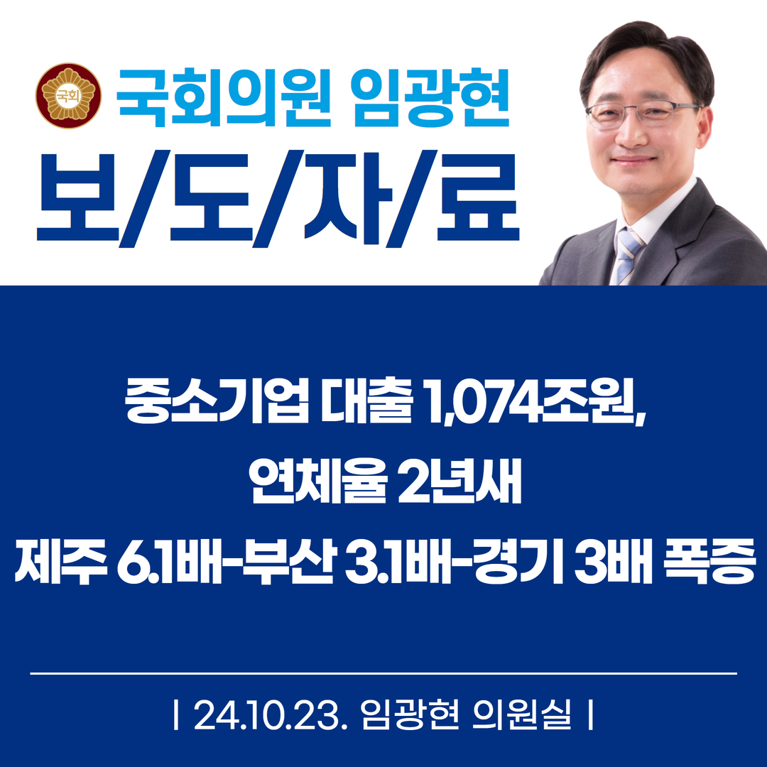 [임광현의원 국감 보도] 중소기업 대출 1,074조원, 연체율 2년새 제주 6.1배-부산 3.1배-경기 3배 폭증전국 중소기업대출 연체율 2.4배 증가세