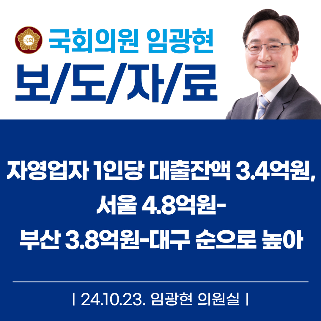 [임광현의원 국감 보도] 자영업자 1인당 대출잔액 3.4억원, 서울 4.8억원-부산 3.8억원-대구 순으로 높아