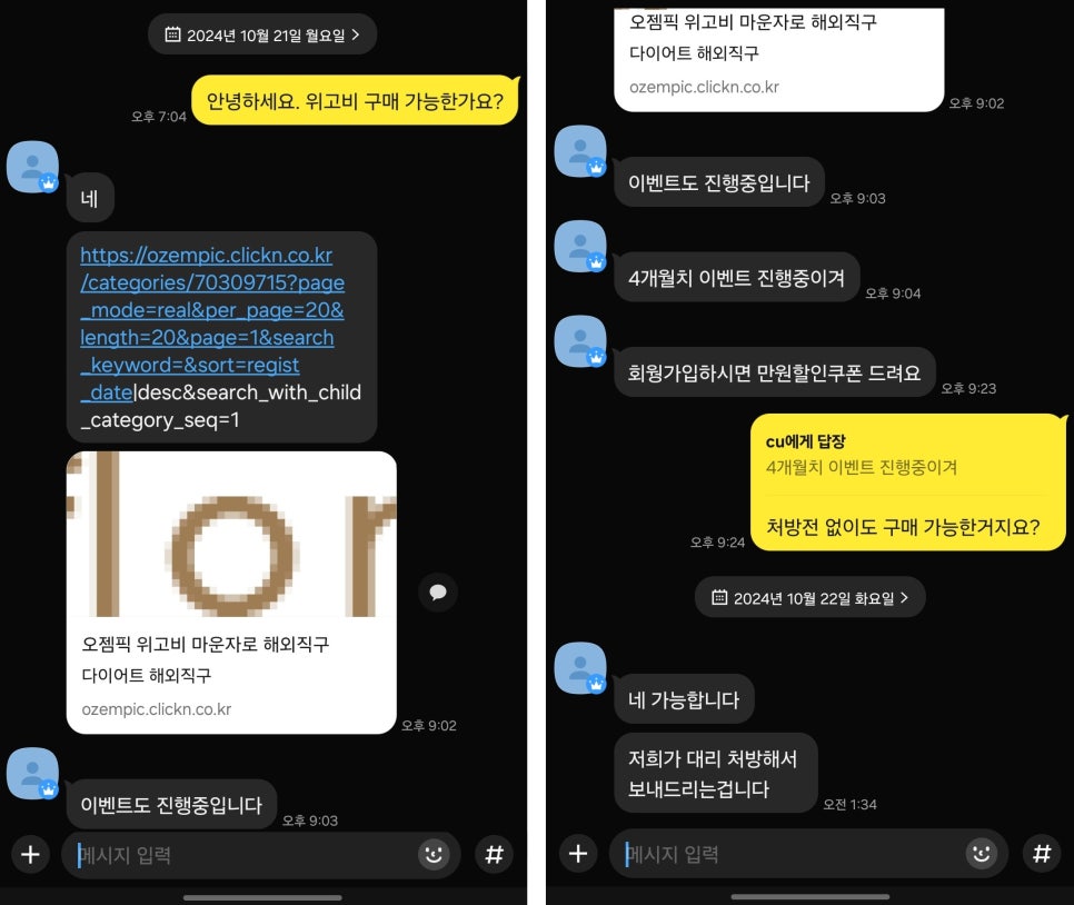 □ 장 의원은 “해당 사이트에 접속해보니, 각기 다른 용량의 위고비는 물론 국내에 아직 출시되지 않은 ‘마운자로’와 같은 다이어트 의약품도 판매되고 있었다”며 “실제 판매자에게 메신저로 구매 가능 여부를 물었더니, 4개월치 이벤트도 진행 중이라며 회원 가입을 유도했다”고 설명했다. 또한 “처방전 없이도 구매가 가능하냐”는 질문에 “대리 처방해서 보내드리기 때문에 가능하다”는 답변이 돌아왔다.