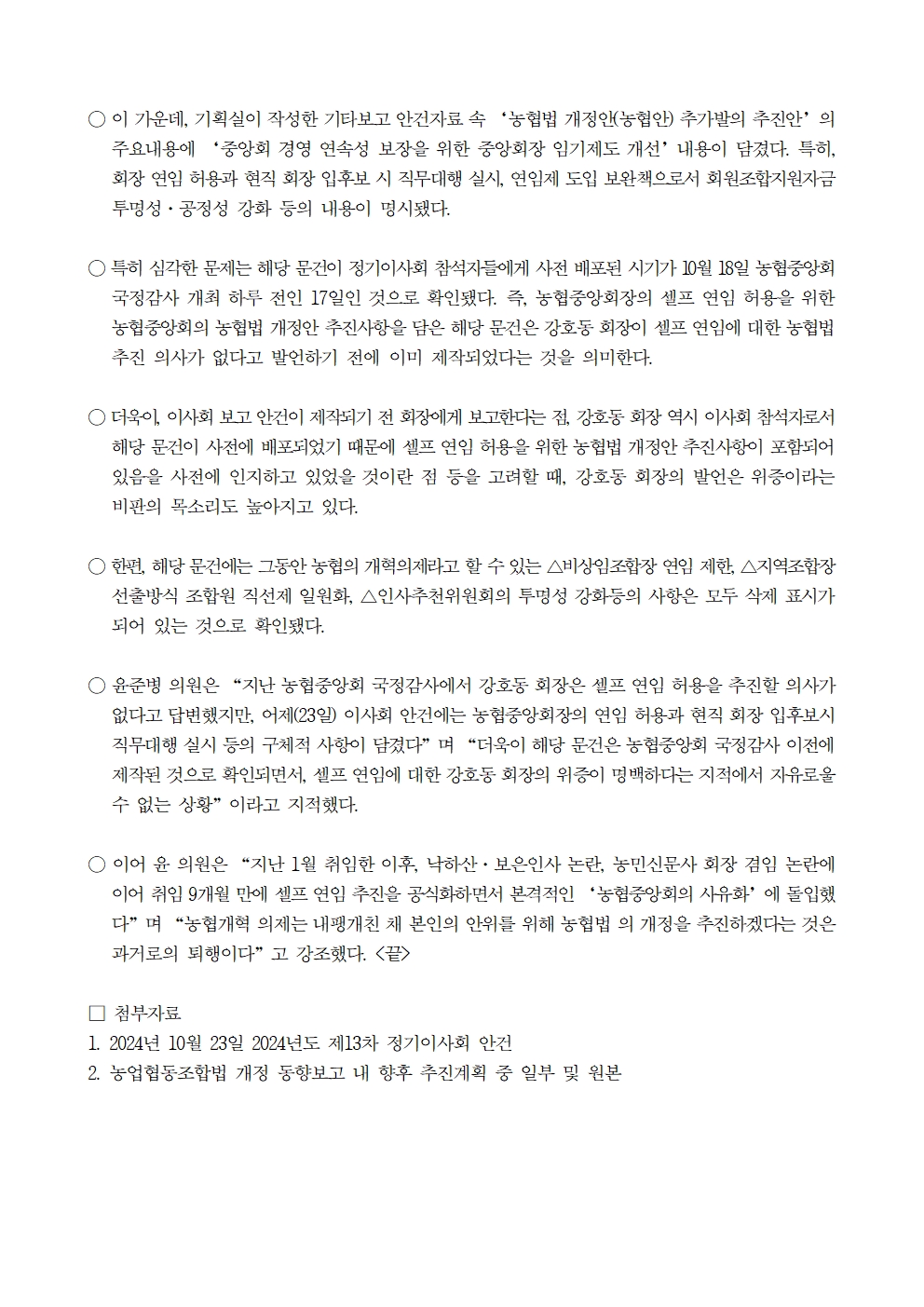 241024 [윤준병 의원 국정감사 보도자료] 강호동 농협중앙회장 셀프 연임 추진 위증 의혹.hwp