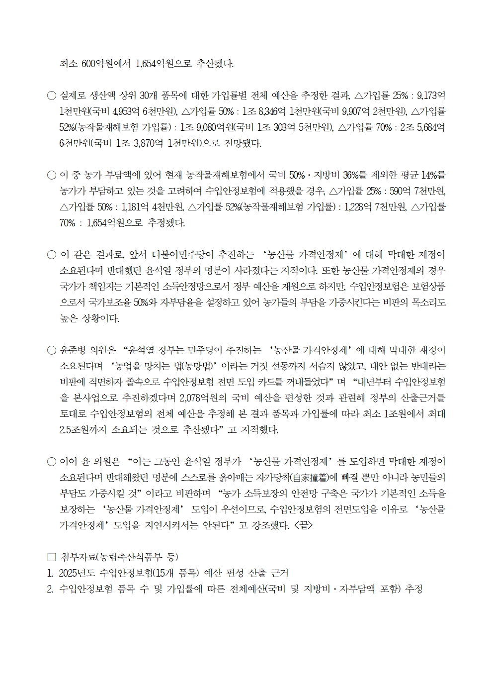 241024 [윤준병 의원 국정감사 보도자료] 수입안정보험 25조원·농가부담 1600억 추정!.hwp