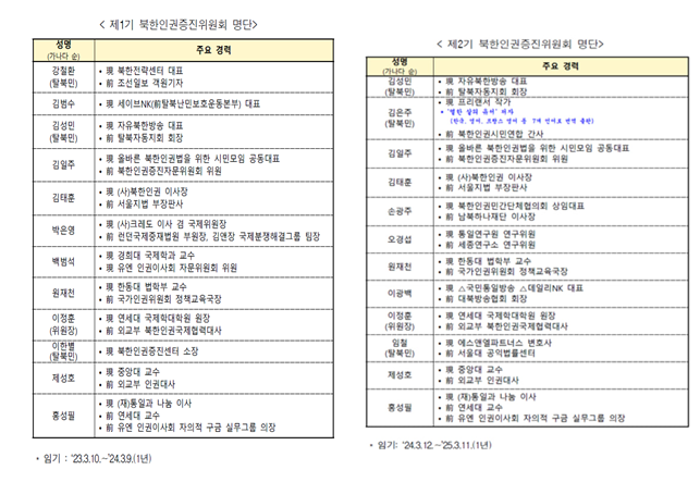 제1기, 제2기 통일부 북한인권증진위원회 명단(통일부 제출자료) 1부.  끝.