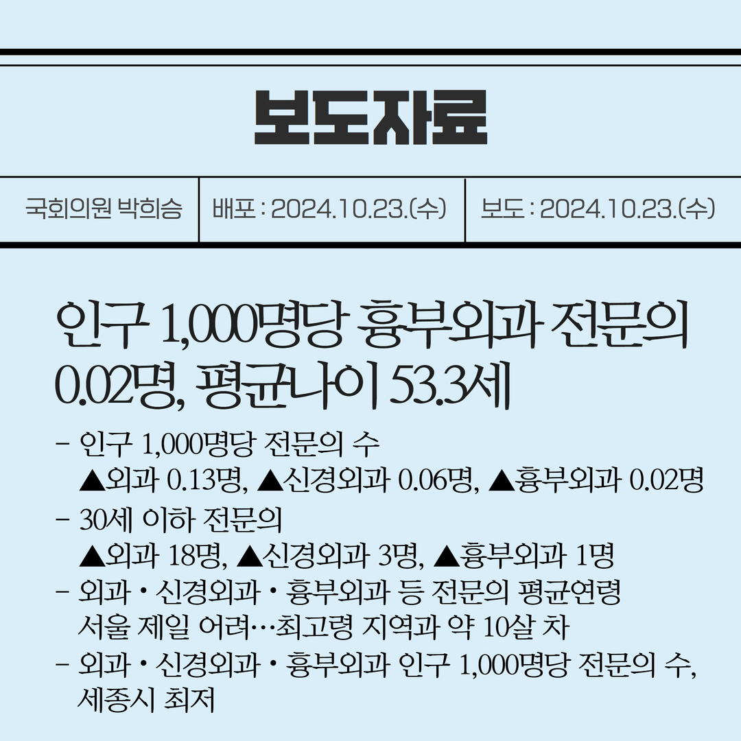 [국회의원 박희승 보도자료] 인구 1,000명당 흉부외과 전문의 0.02명, 평균나이 53.3세