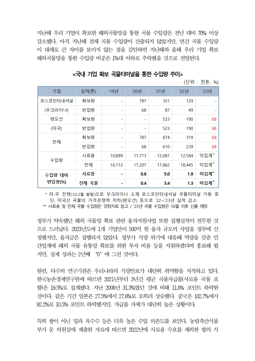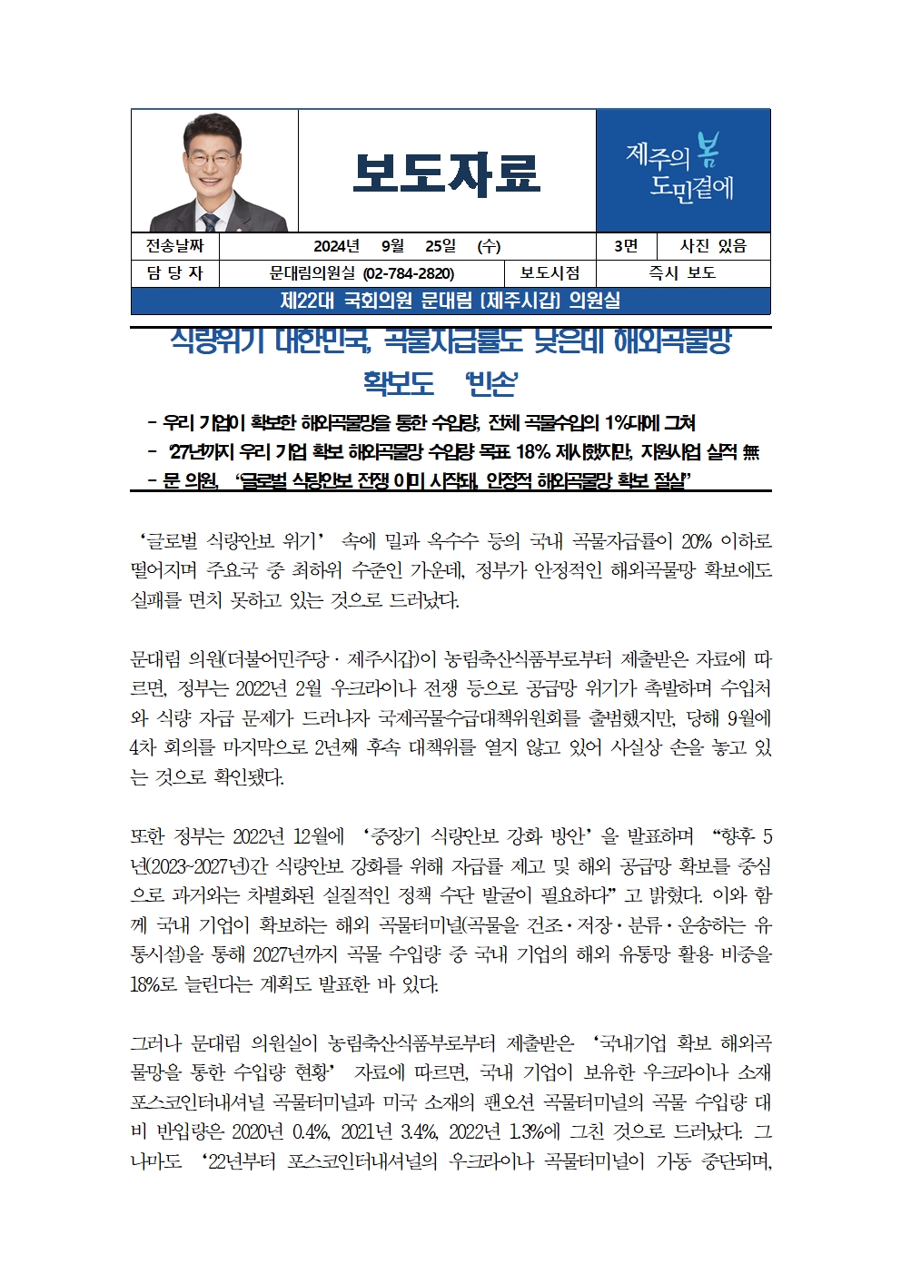 [문대림 의원실] 20240925 보도자료 (식량위기 대한민국 해외곡물망 확보 빈손).hwp