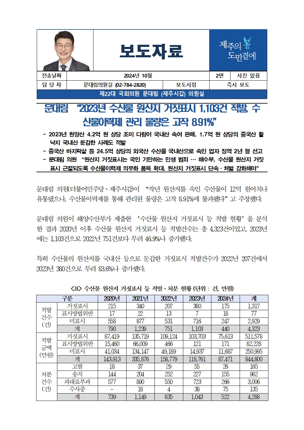 [국회의원 문대림] “2023년 수산물 원산지 거짓표시 1,103건 적발, 수산물이력제 관리 물량은 고작 8.91%”