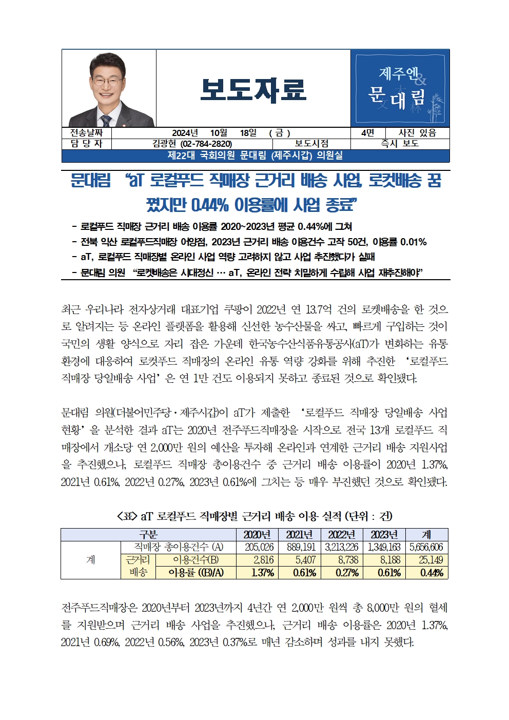 [국회의원 문대림] aT 로컬푸드 직매장 근거리 배송 사업, 로컷배송 꿈꿨지만 0.44% 이용률에 사업 종료