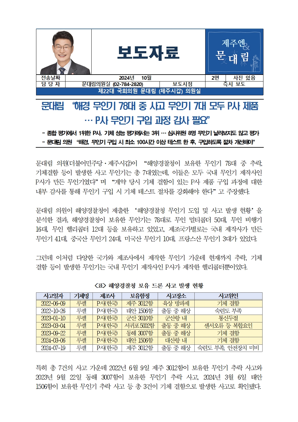 [국회의원 문대림] 해경 무인기 78대 중 사고 무인기 7대 모두 P사 제품 … P사 무인기 구입 과정 감사 필요