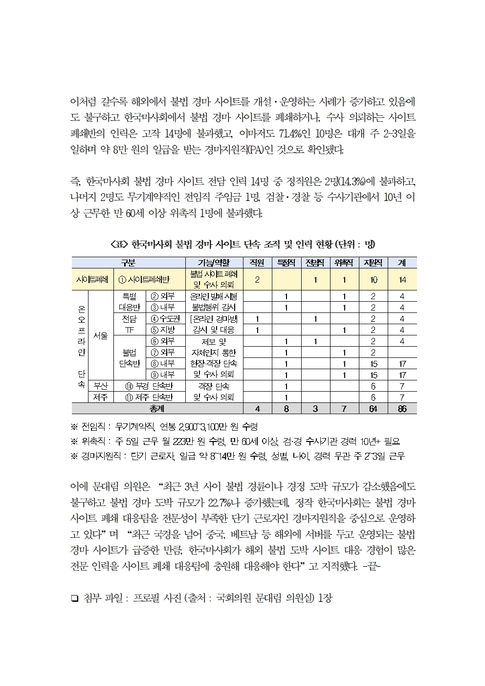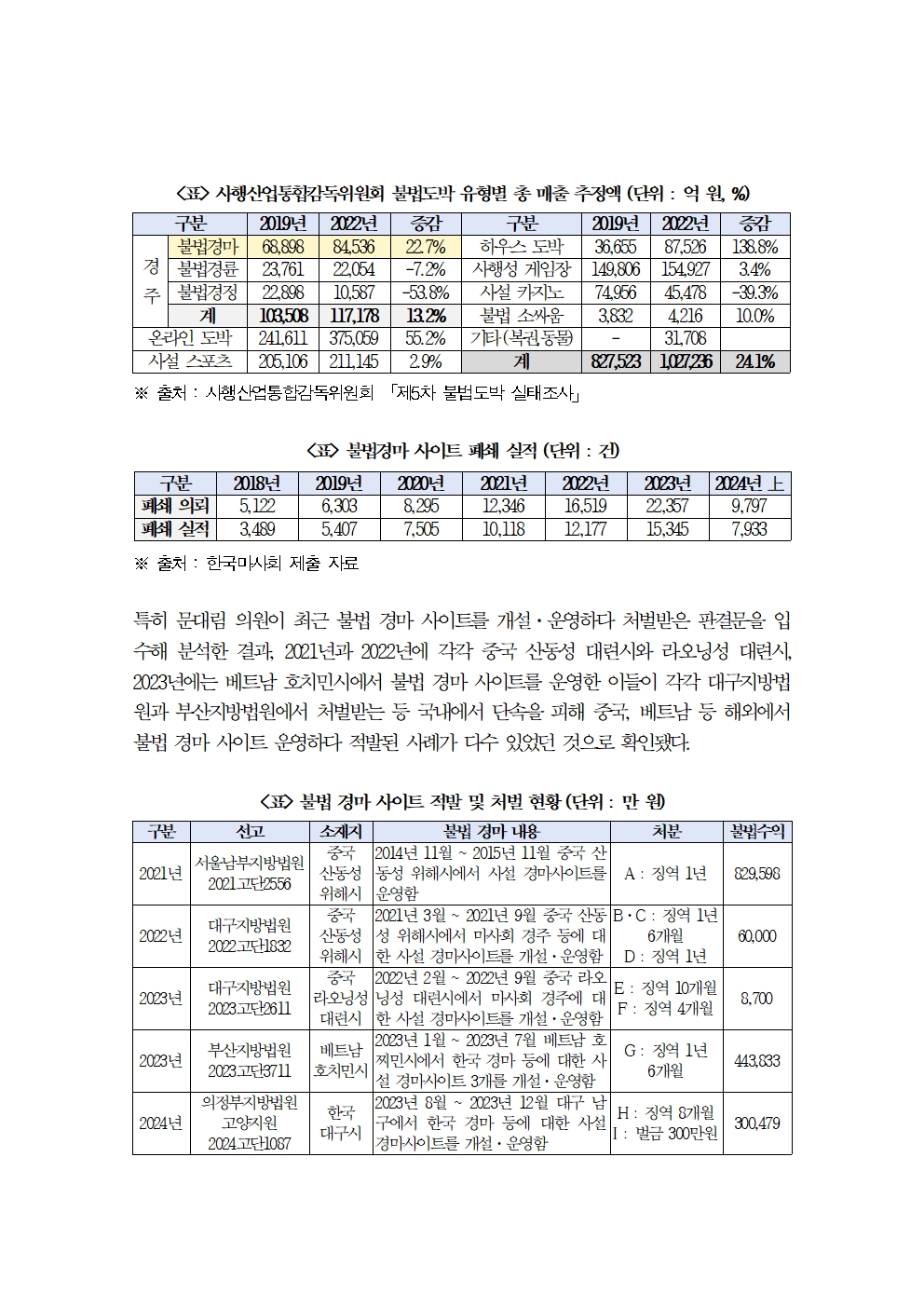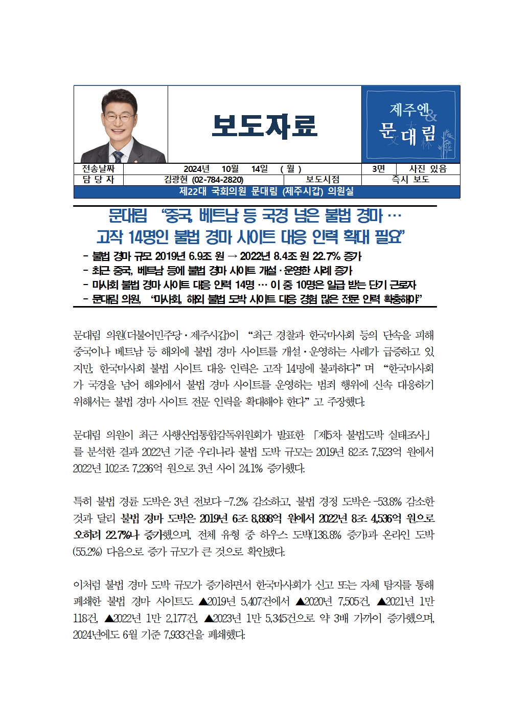 [국회의원 문대림] 중국, 베트남 등 국경 넘은 불법 경마 …고작 14명인 불법 경마 사이트 대응 인력 확대 필요