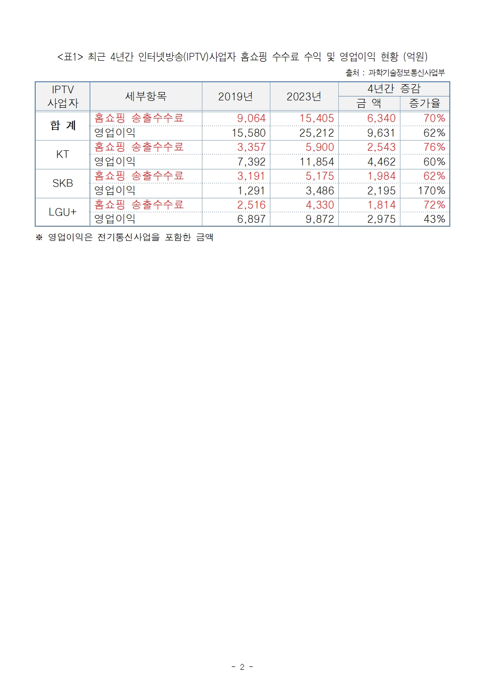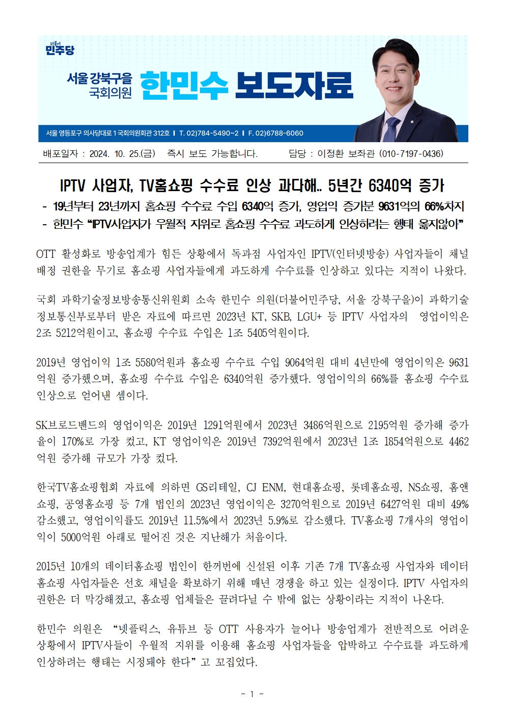 [국회의원 한민수] IPTV 사업자, TV홈쇼핑 수수료 인상 과다해.. 5년간 6340억 증가