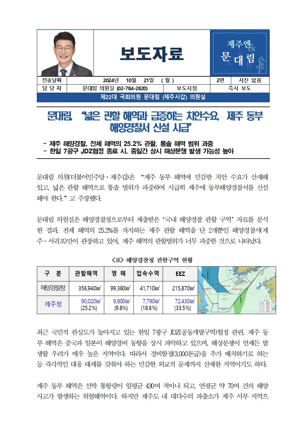 [국회의원 문대림] 넓은 관할 해역과 급증하는 치안수요, 제주 동부해양경찰서 신설 시급