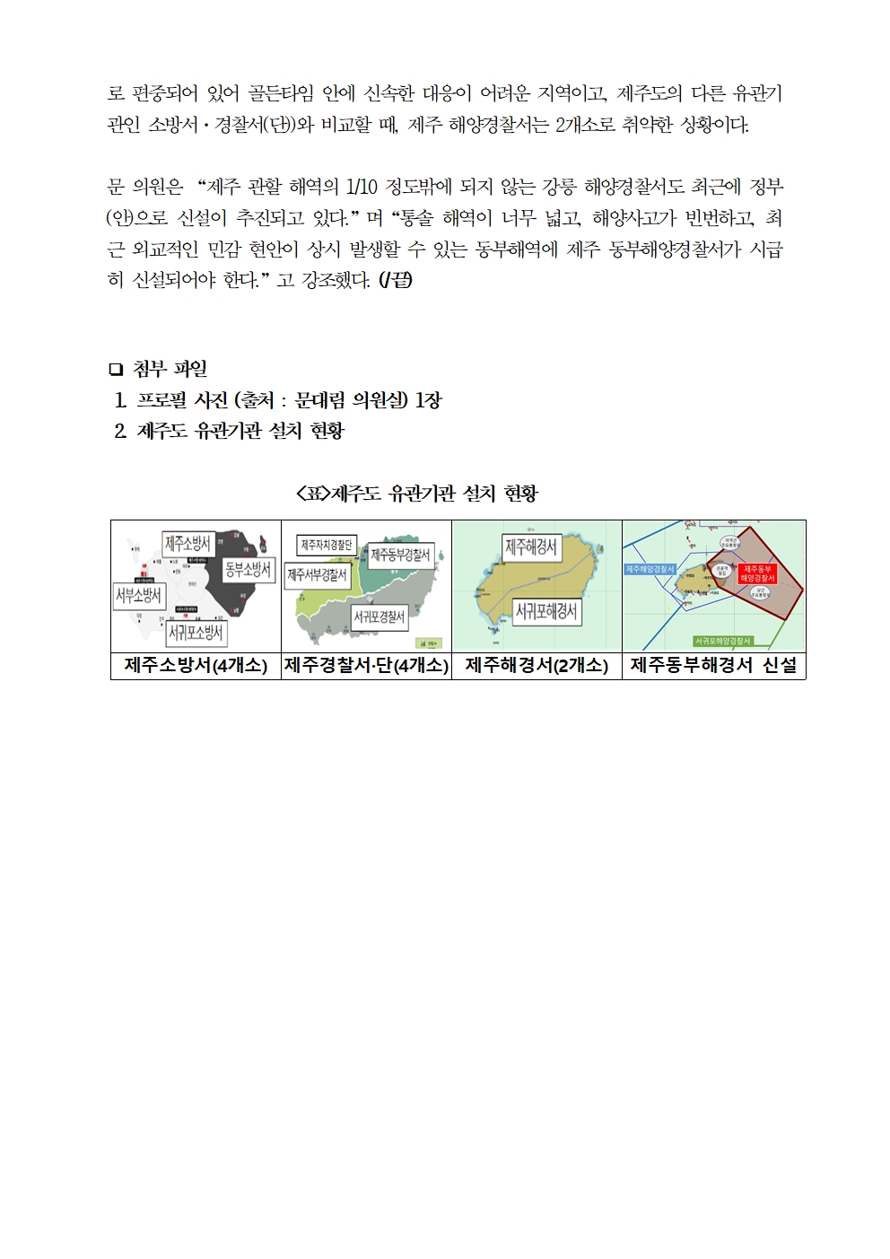 [문대림 의원 보도자료 - 해양경찰청] 급증하는 해역치안수요 제주동부해양경찰서 신설 시급.hwp