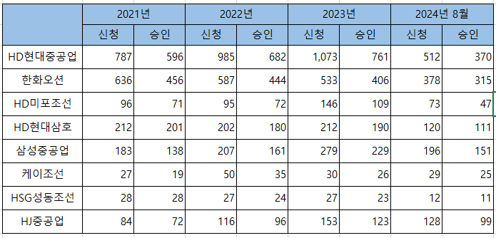 2021년부터 2024년 8월까지 8대 조선소(현대중공업, 한화오션, 삼성중공업, 현대미포조선, 삼호중공업, 케이조선, HSG성동조선, HJ중공업)의 산재처리 현황을 보면, 8대 조선소에서 총 8,223건의 산재신청이 이루어져 총 6,271건이 승인 처리됐다.