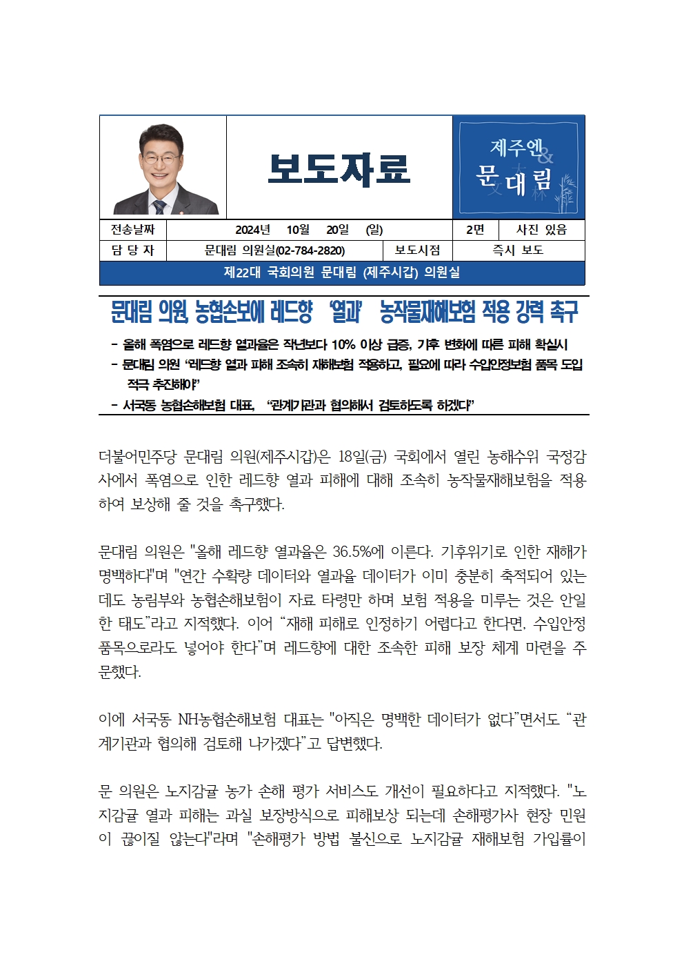 [문대림 의원 보도자료] 문대림 농협손보에 레드향 ‘열과’ 농작물재해보험 적용 강력 촉구.hwp