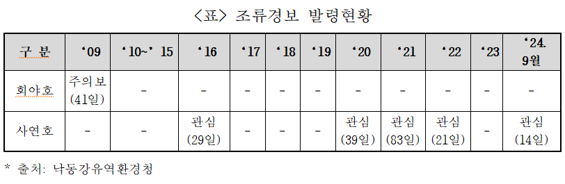 김 의원이 환경부로부터 제출받은 자료에 따르면 회야호의 녹조가 육안으로만 봐도 매우 심각한 수준임에도 정부는 최근 15년간 단 한 번의 조류경보도 발령하지 않았다. 인체에 심각한 영향을 주는 독소 검사는 하지 않은 채 남조류 세포 수만을 기준으로 경보 발령 여부를 검토하고 있기 때문이다. 정부가 손을 놓고 있는 사이 낙동강 인근 주민의 몸에서는 녹조 독소 유전자가 검출되는 등 주민들의 불안은 커지고 있다.