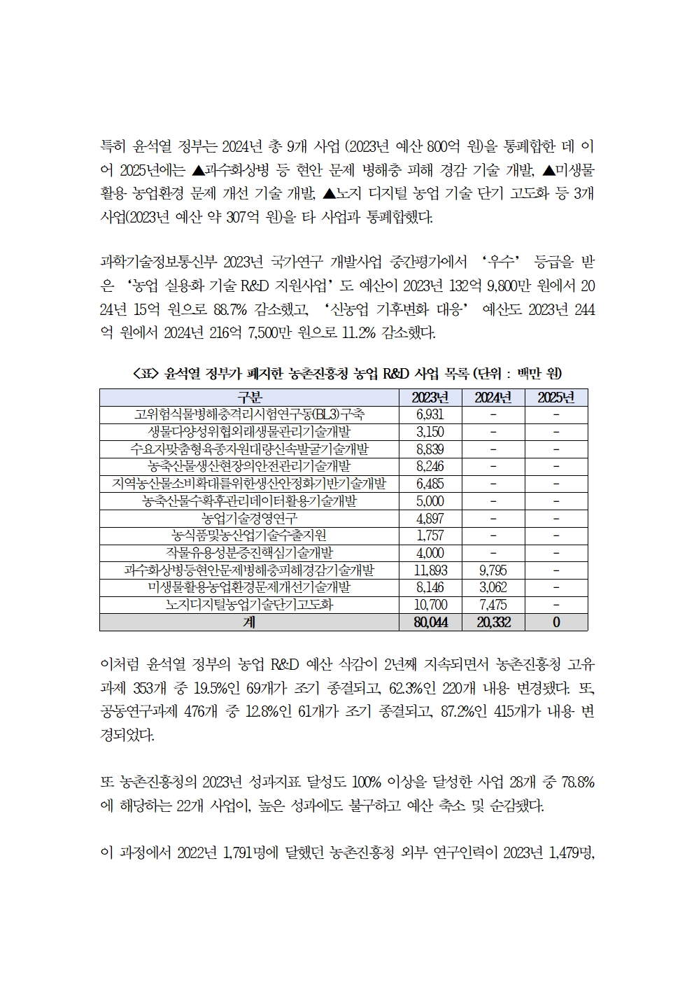 [문대림 의원 보도자료 - 농촌진흥청] 문대림 “尹 정부 농업 R&D 홀대 … 2025년 예산도 2023년보다 19.9% 감소.hwp