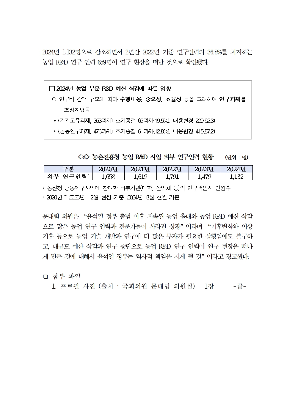 [국회의원 문대림] 尹 정부 농업 R&D 홀대 … 2025년 예산도 2023년보다 19.9% 감소, 농업 연구 인력 659명 떠나