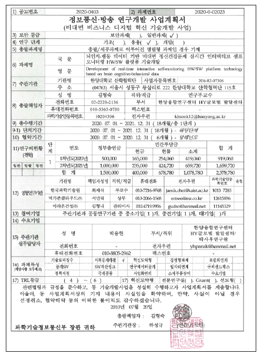 불임 2. 2020년 정보통신‧방송 연구개발 사업계획서(총괄책임자 : 김형숙)