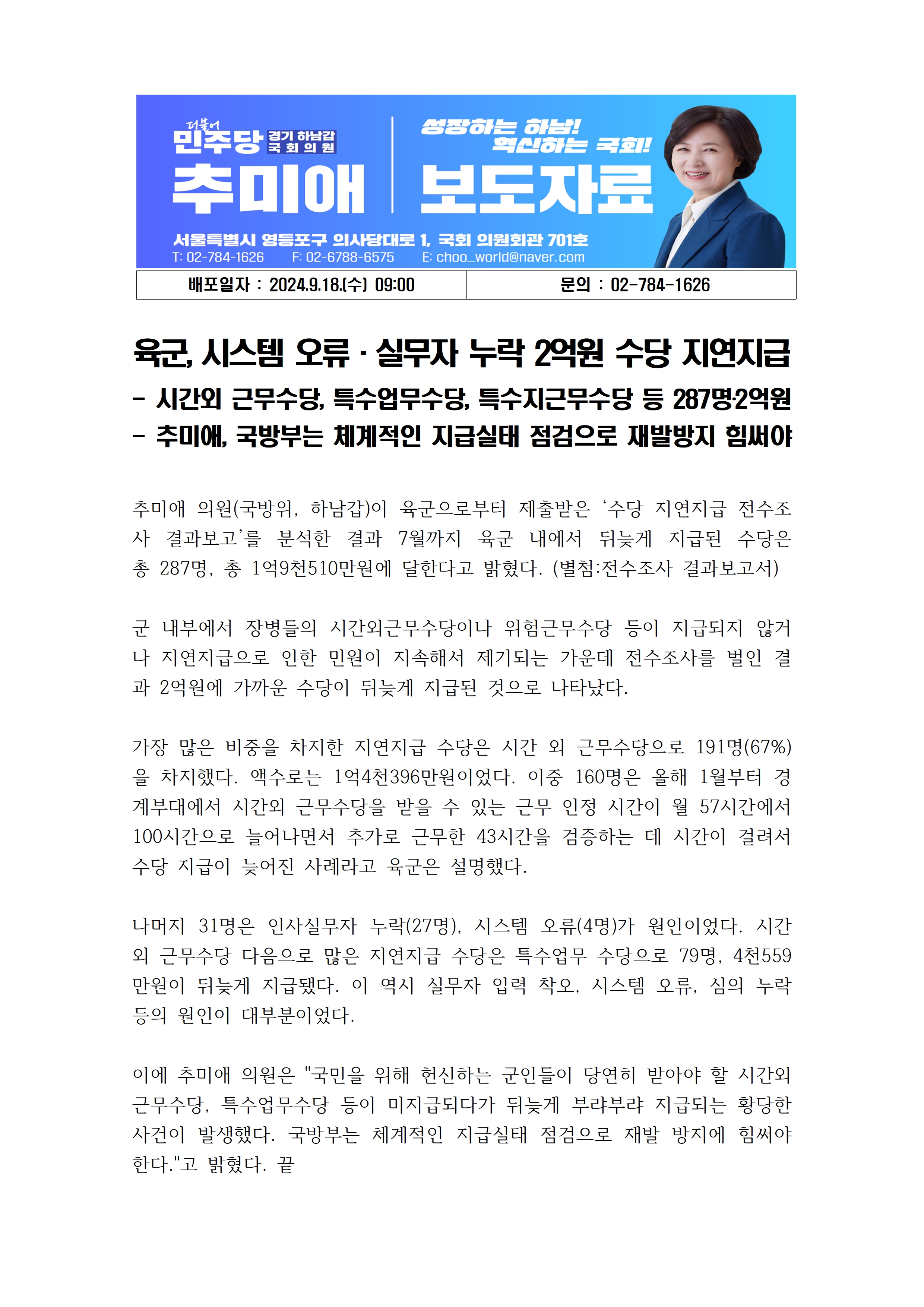 (추미애 보도자료) 육군 수당 미지급 2억_0918.hwp