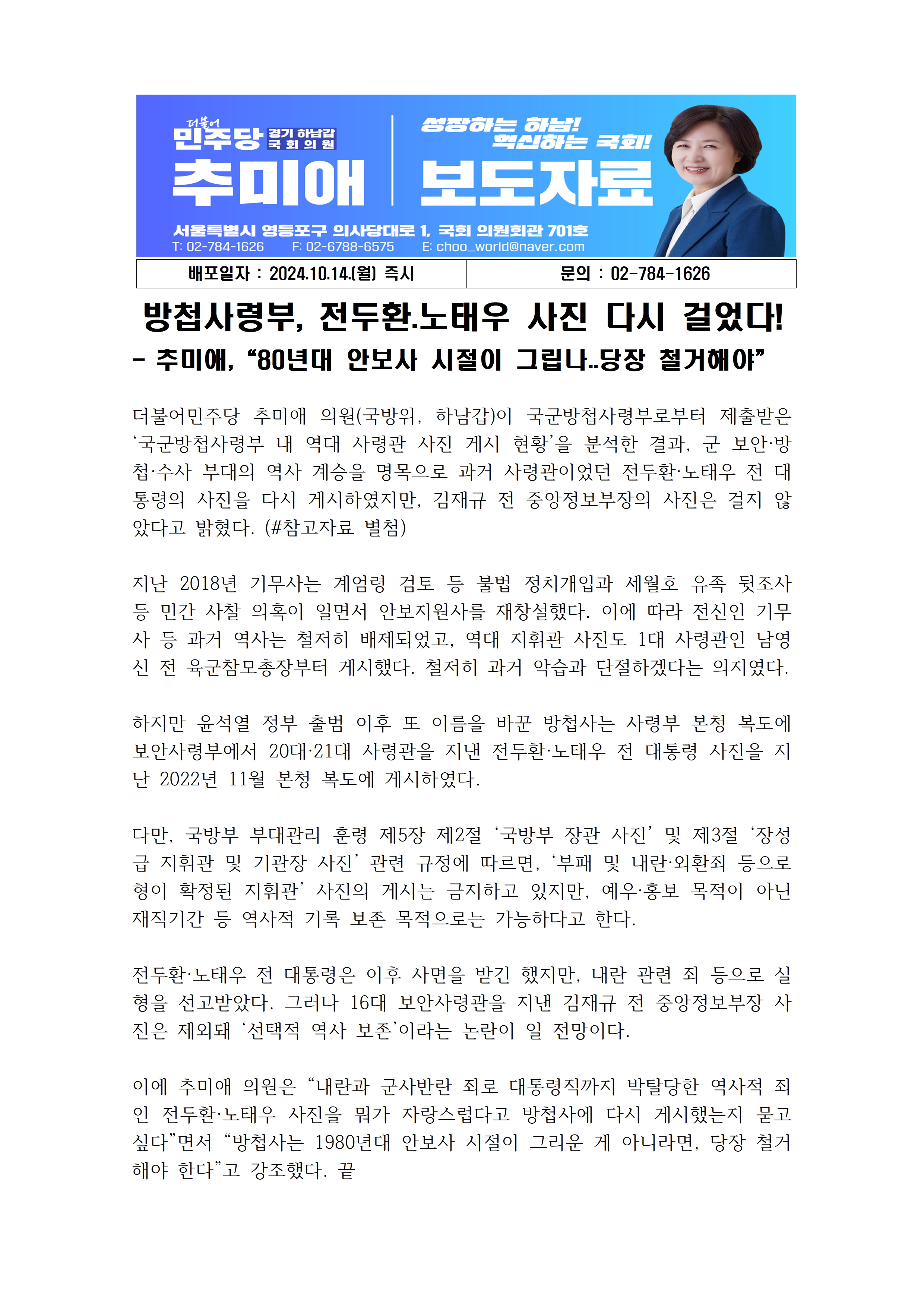 추미애_보도자료_방첩사_전두환_노태우_사진_다시_걸었다_1014.hwp