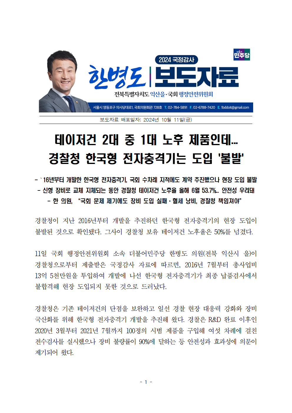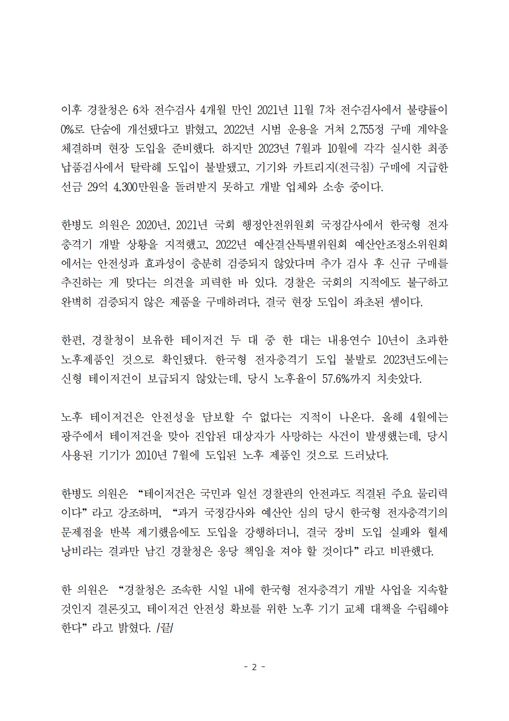 [한병도의원]2024행안위국정감사보도자료(33)테이저건 2대 중 1대 노후 제품인데... 경찰청 한국형 전자충격기는 도입 불발.hwp