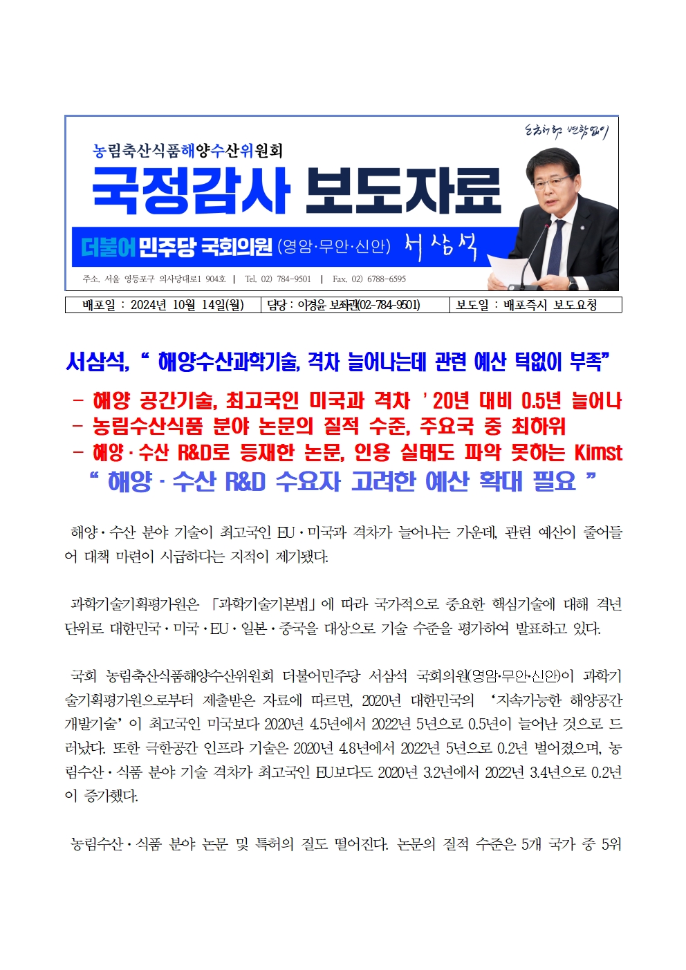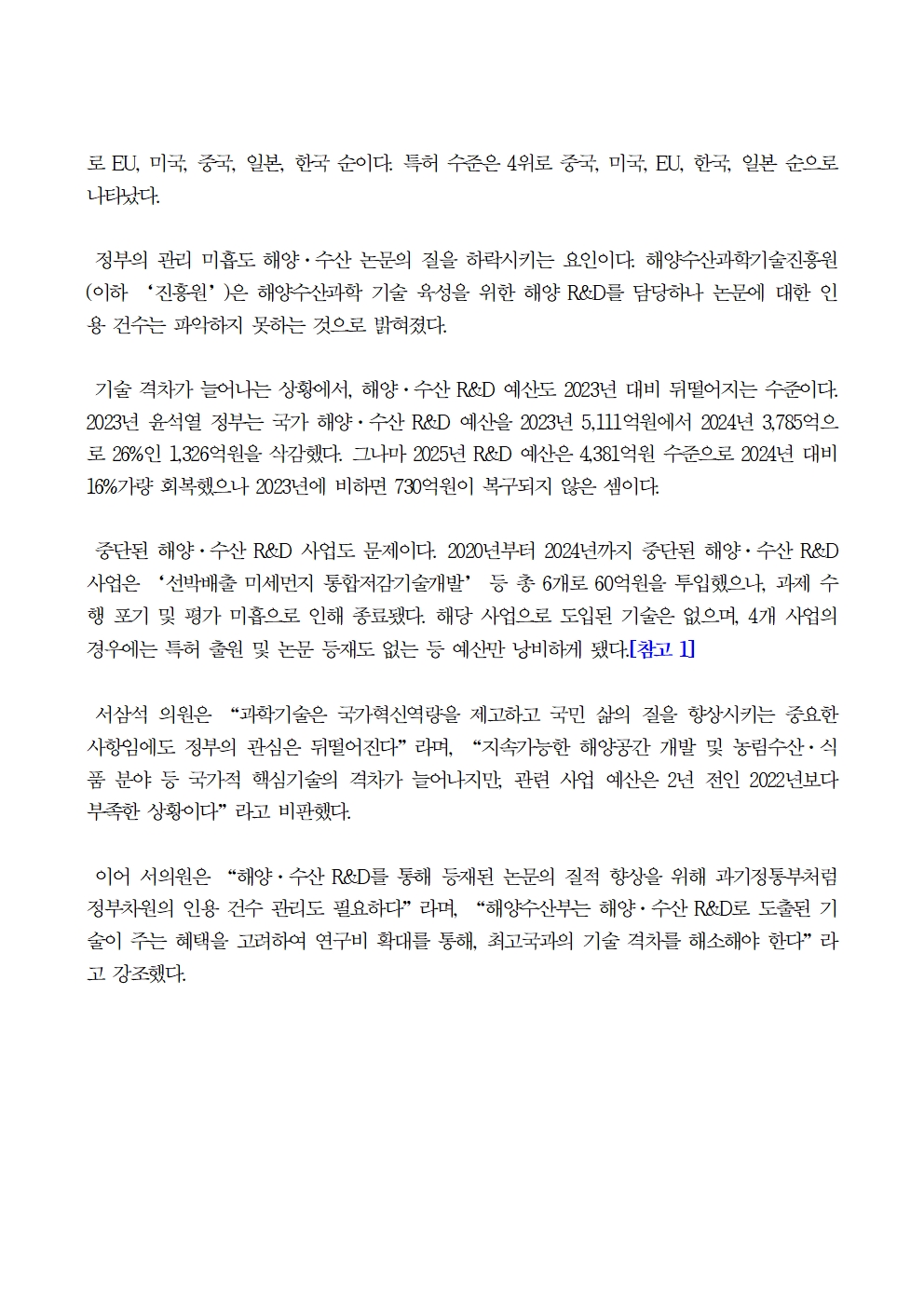[국회의원 서삼석] 해양수산과학기술 격차 늘어나는데 관련 예산 턱없이 부족