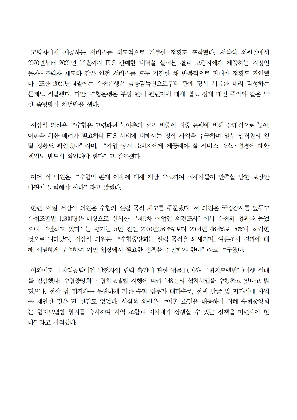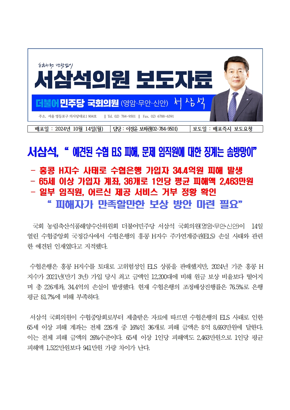 [국회의원 서삼석] 예견된 수협 ELS 피해 문제 임직원에 대한 징계는 솜방망이
