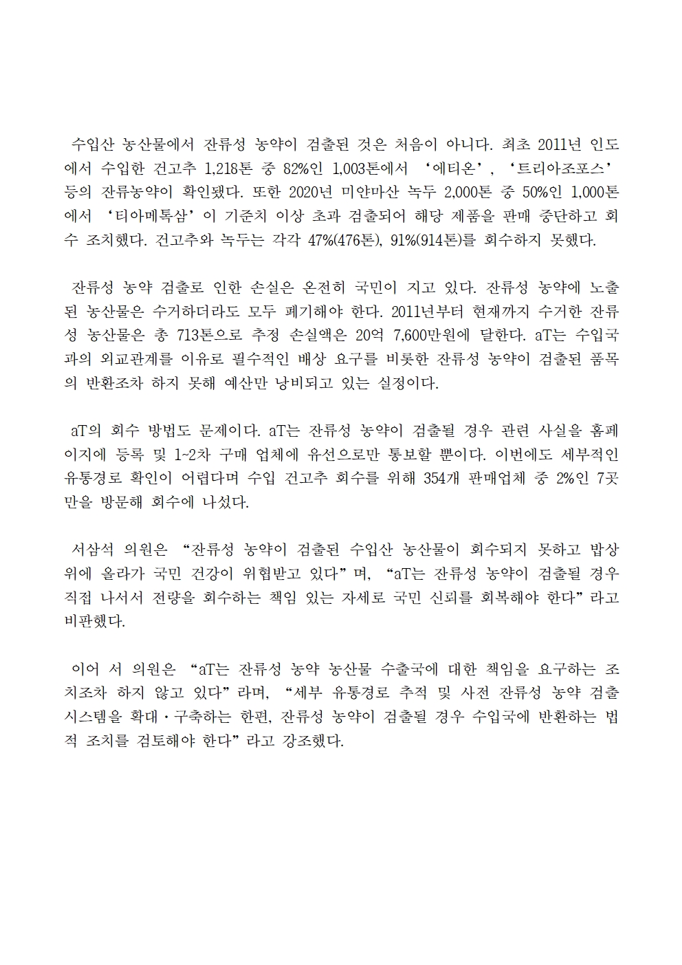 [국회의원 서삼석] 수입 건고추 잔류성 농약 검출에도 판매업체 354개 중 2%인 7곳만 방문