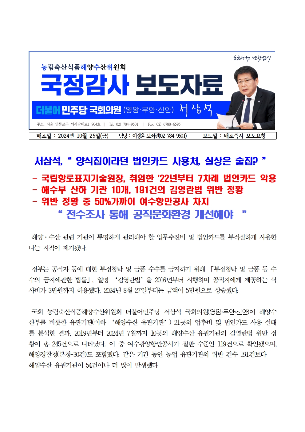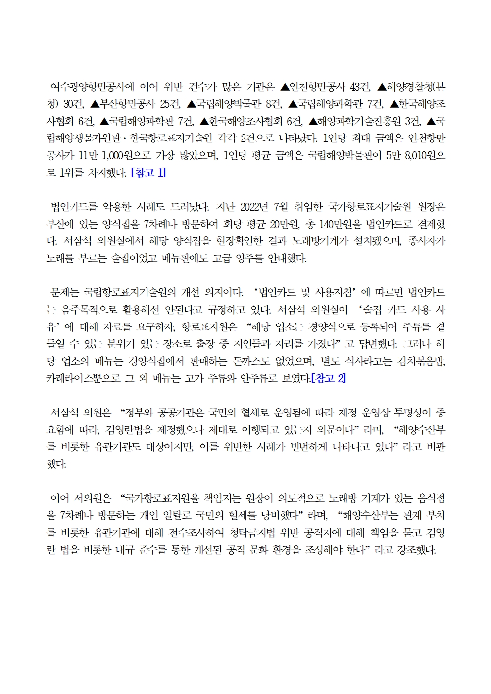 [국회의원 서삼석] 양식집이라던 법인카드 사용처 실상은 술집