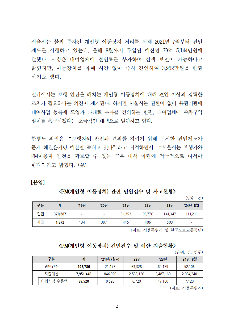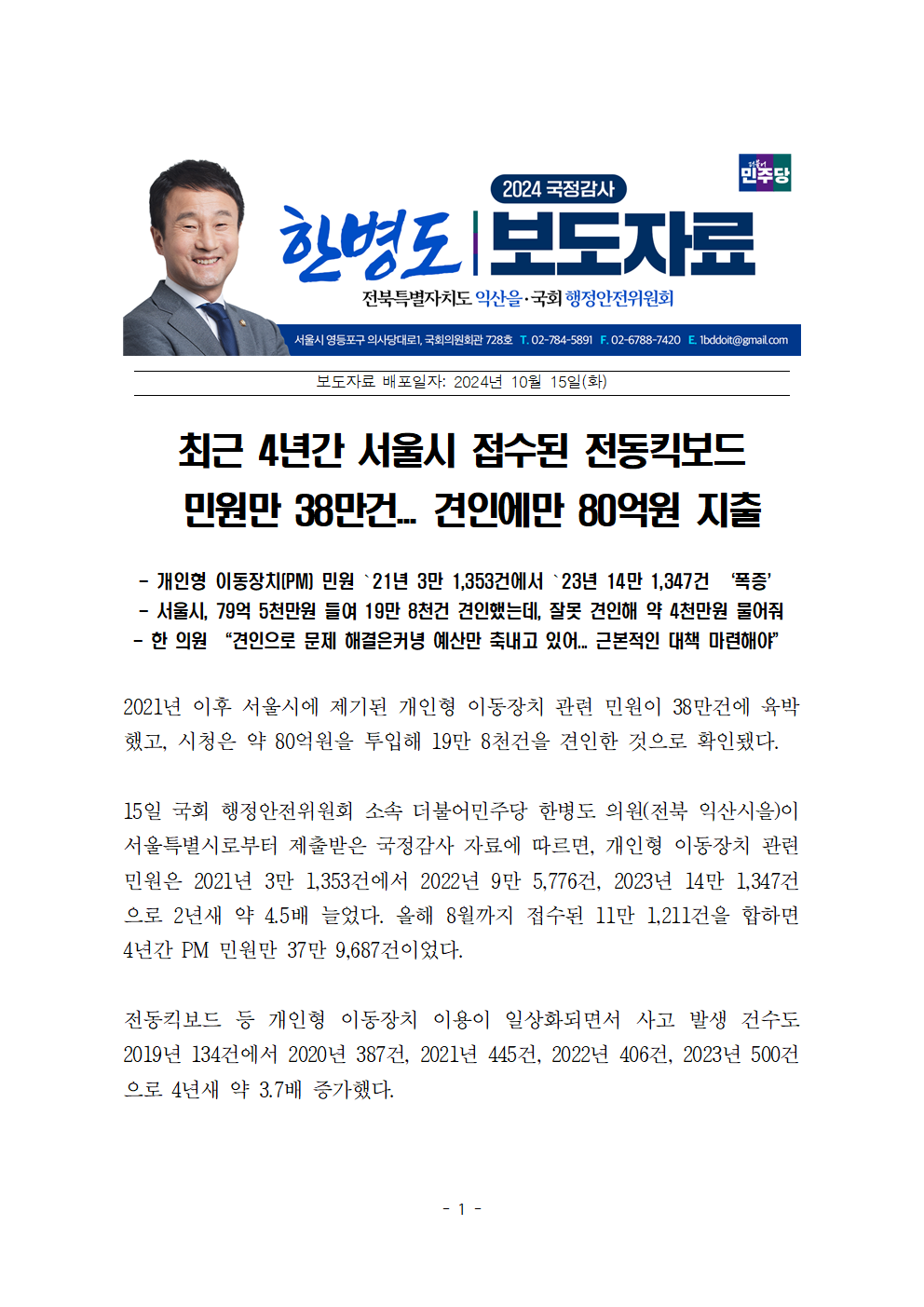 [한병도의원]2024행안위국정감사보도자료(37)최근 4년간 서울시 접수된 전동킥보드 민원만 38만건... 견인에만 80억원 지출.hwp