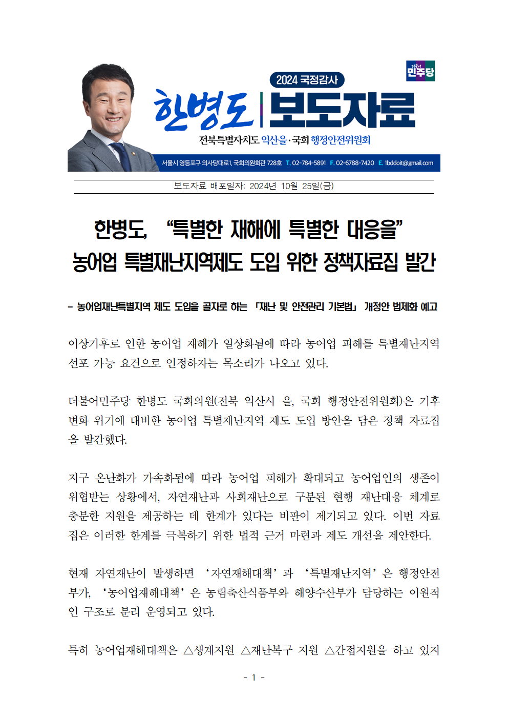 [한병도의원]2024행안위국정감사보도자료(45)한병도 “특별한 재해에 특별한 대응을” 농어업 특별재난지역제도 도입 위한 정책자료집 발간.hwp
