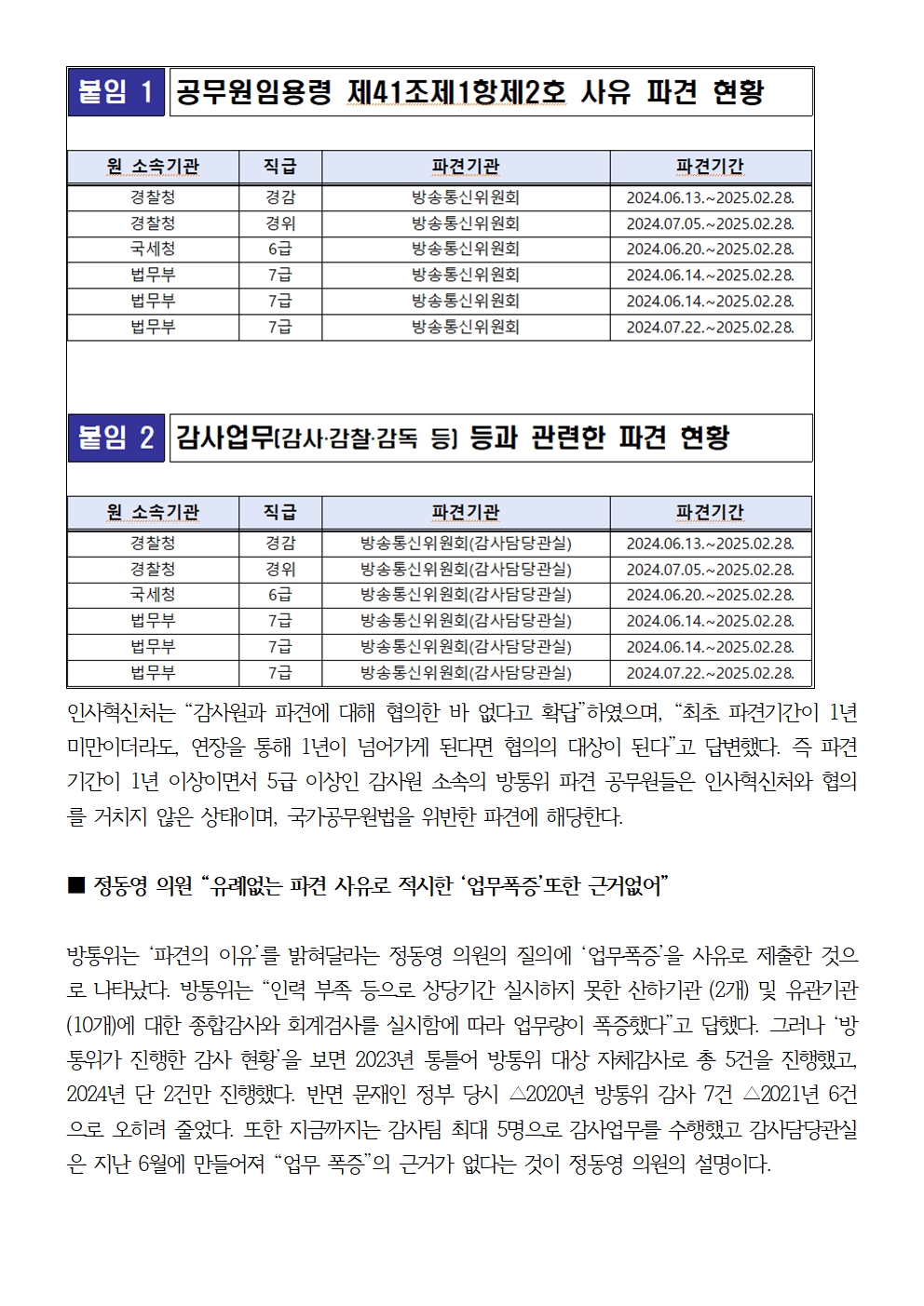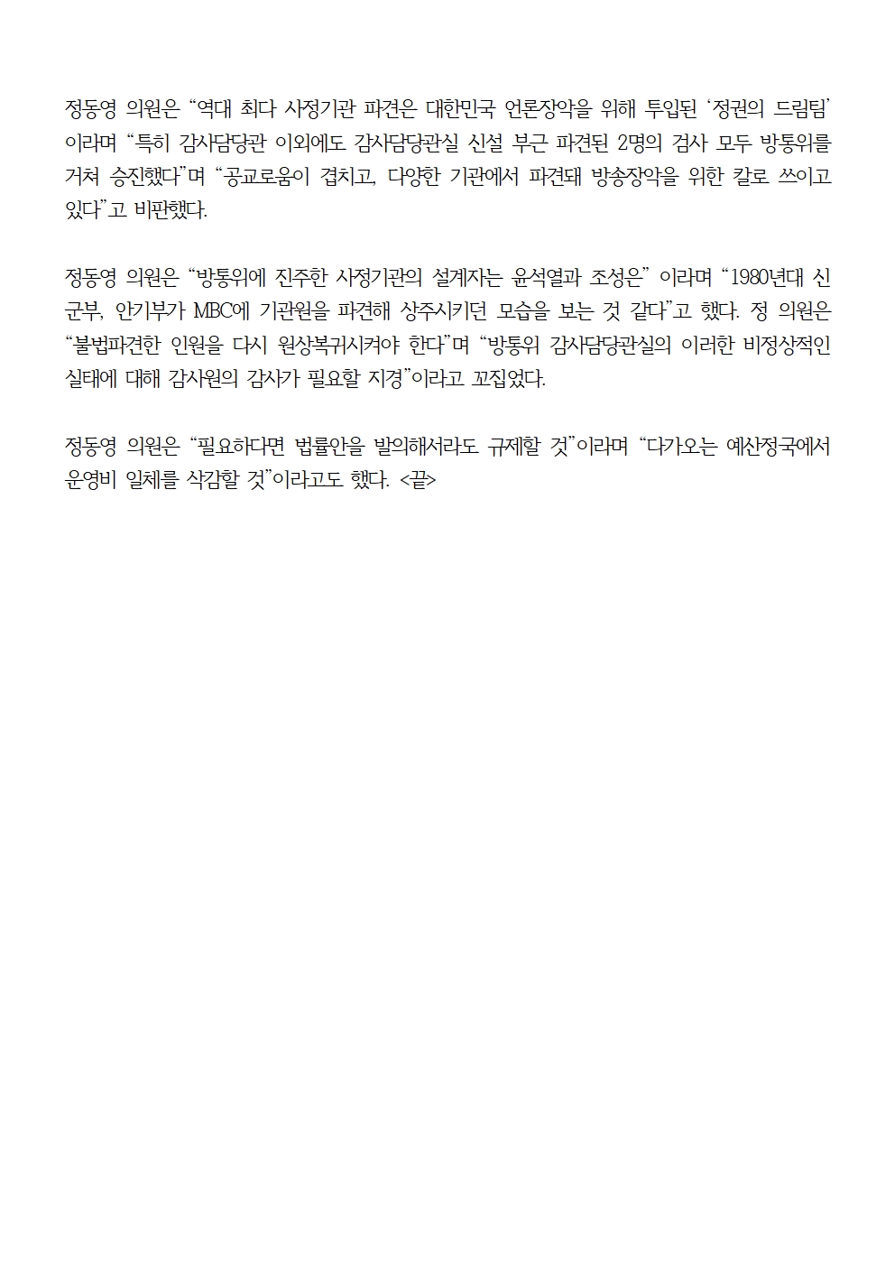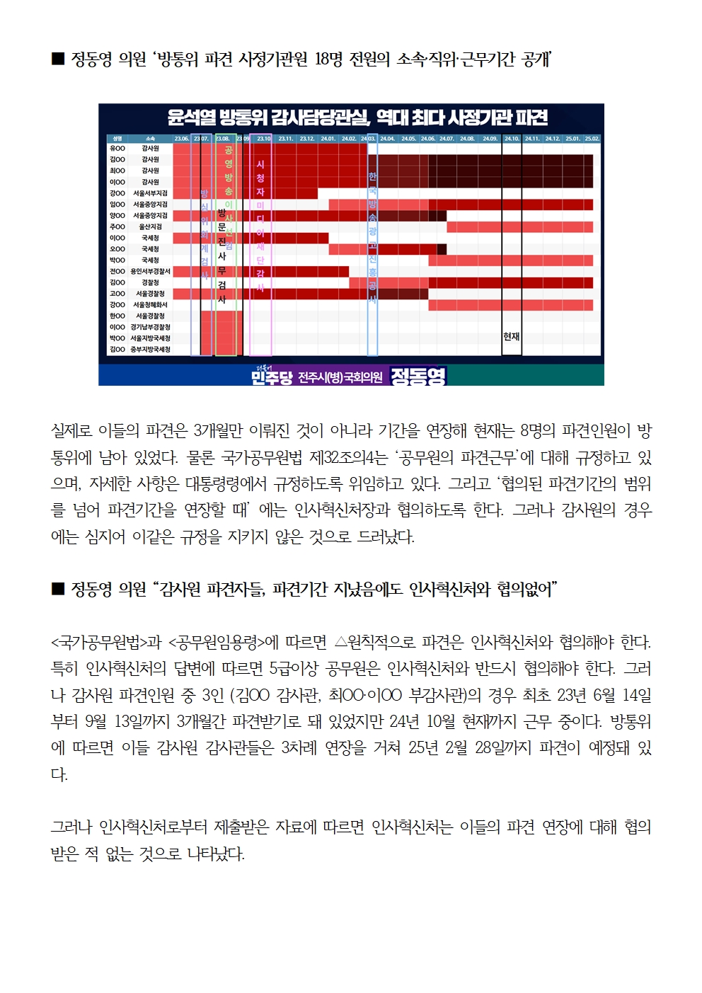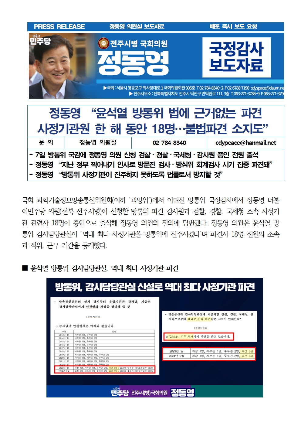 [국회의원 정동영 국감보도자료] 정동영 “윤석열 방통위 법에 근거없는 파견 사정기관원 한 해 동안 18명…불법파견 소지도”
