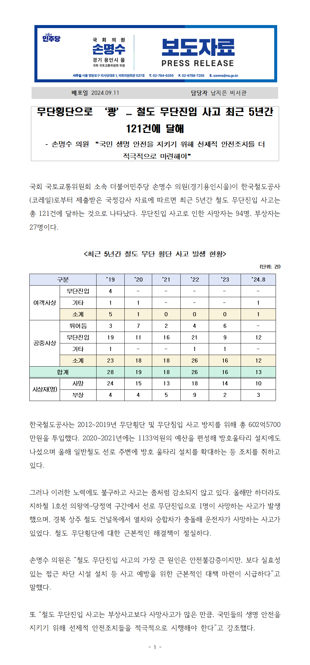 240911_손명수의원실_보도자료_무단횡단으로_‘쾅’...철도_무단진입_사고_최근_5년간_121건에_달해.hwpx
