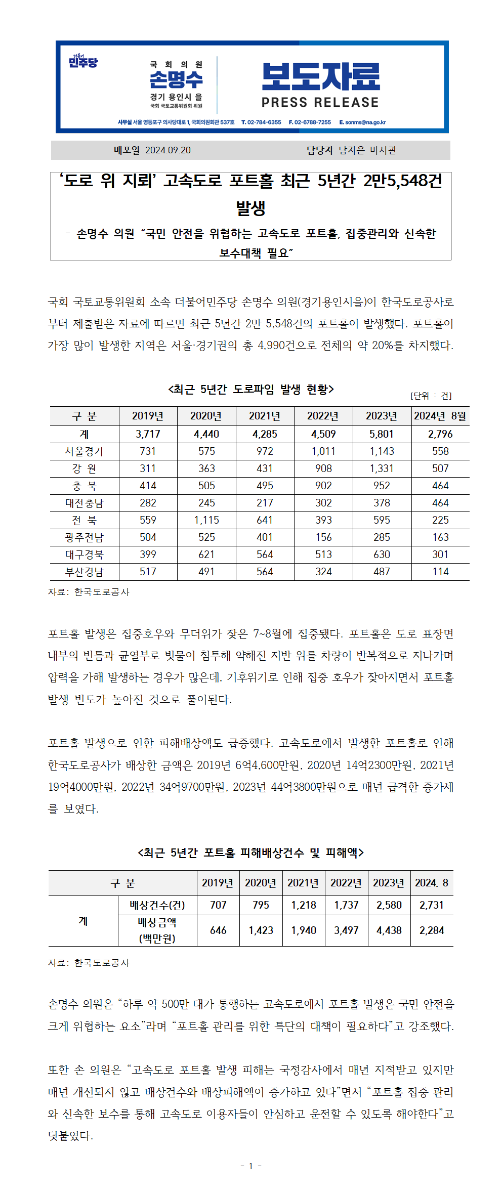 240920_손명수의원실_보도자료_고속도로_포트홀_2만5548건_발생.hwp