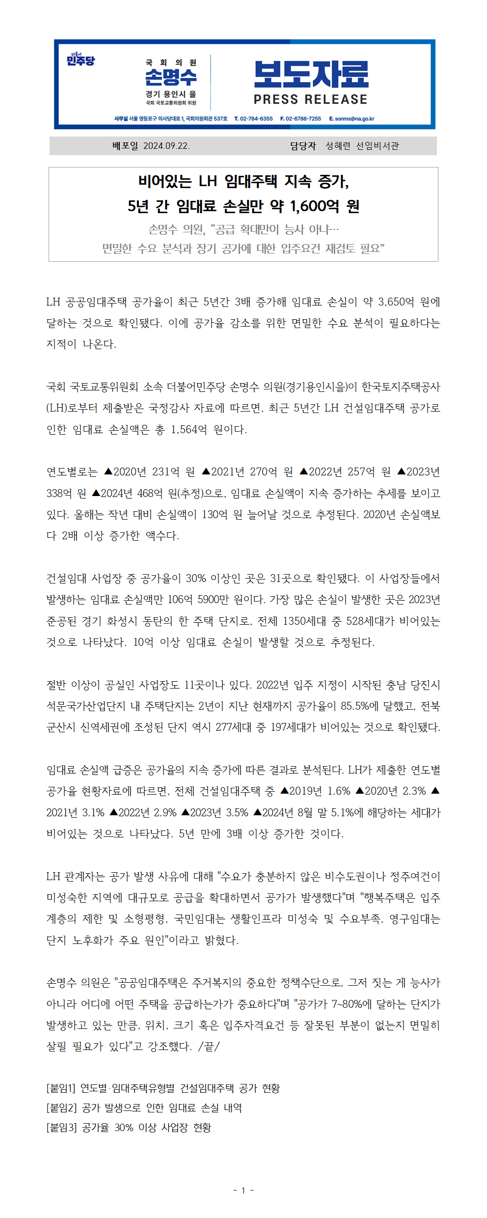 240922_손명수의원실_보도자료_비어있는LH임대주택지속증가_5년간임대료손실만약3650억원.hwp
