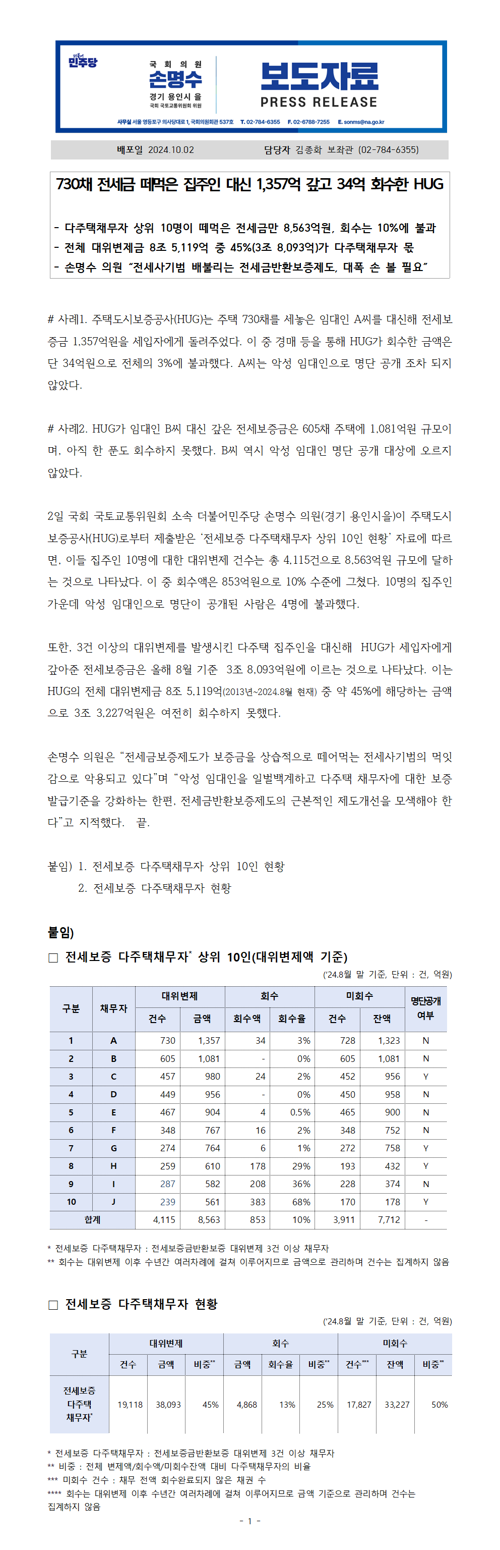 241002_손명수의원실_보도자료_730채 전세금 떼먹은 집주인 대신 1357억 갚고 34억 회수한 HUG.hwp