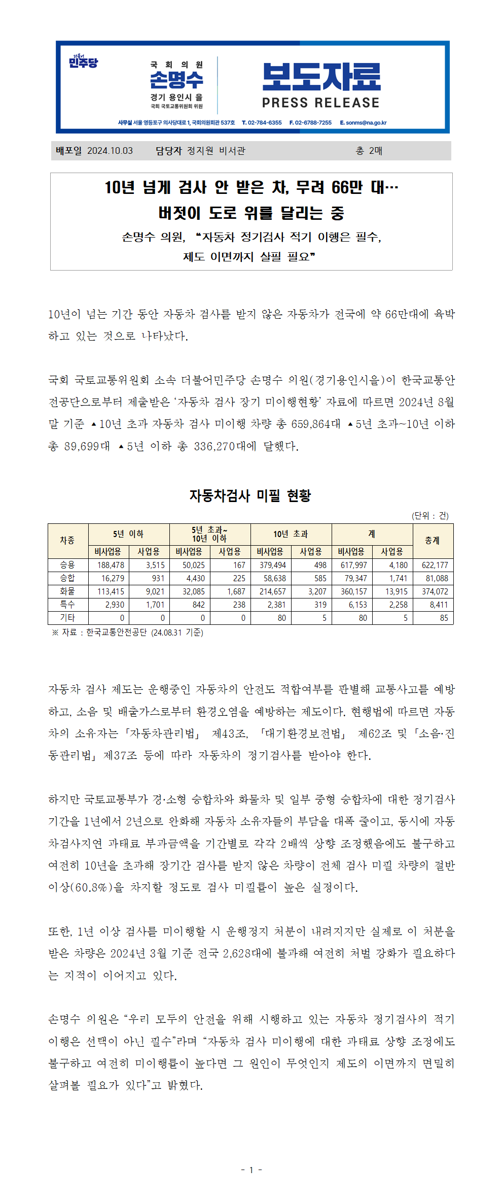 241003_손명수의원실_보도자료_10년 넘게 검사 안 받은 차 무려 66만 대 버젓이 도로 위를 달리는 중.hwp