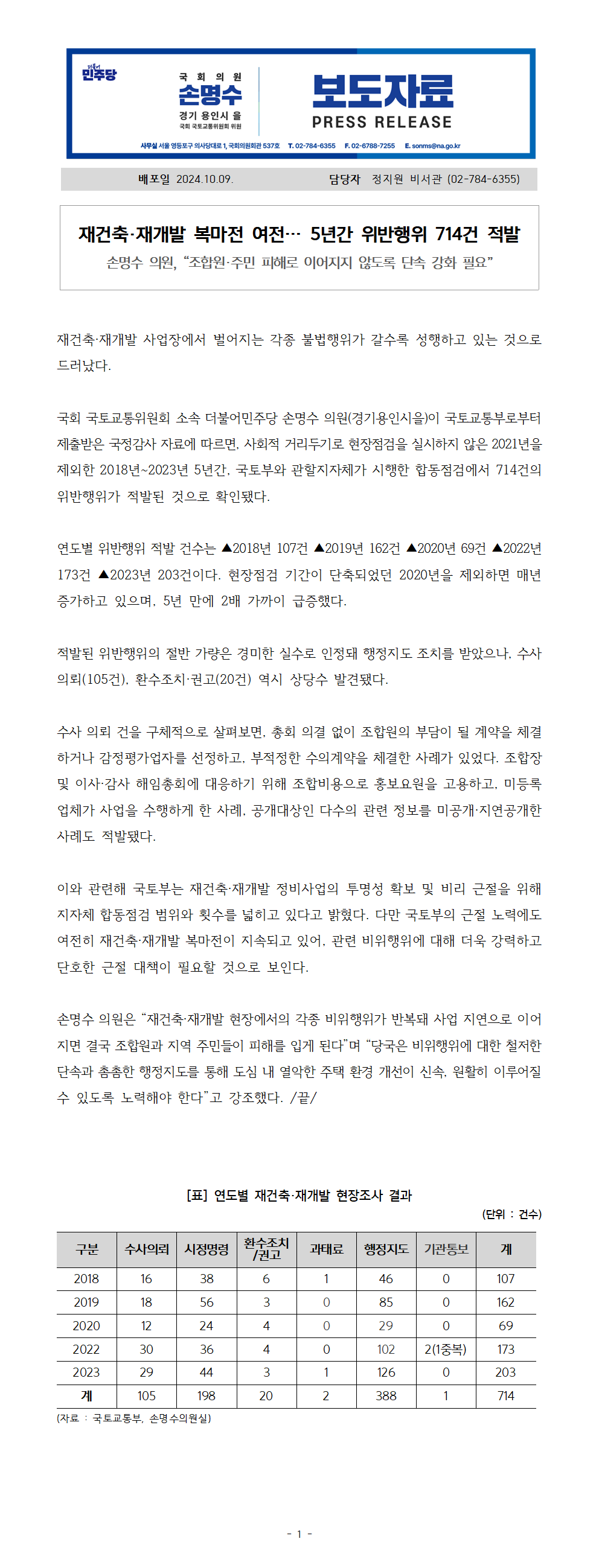 [국회의원 손명수] 재건축·재개발 복마전 여전... 5년간 위반행위 714건 적발