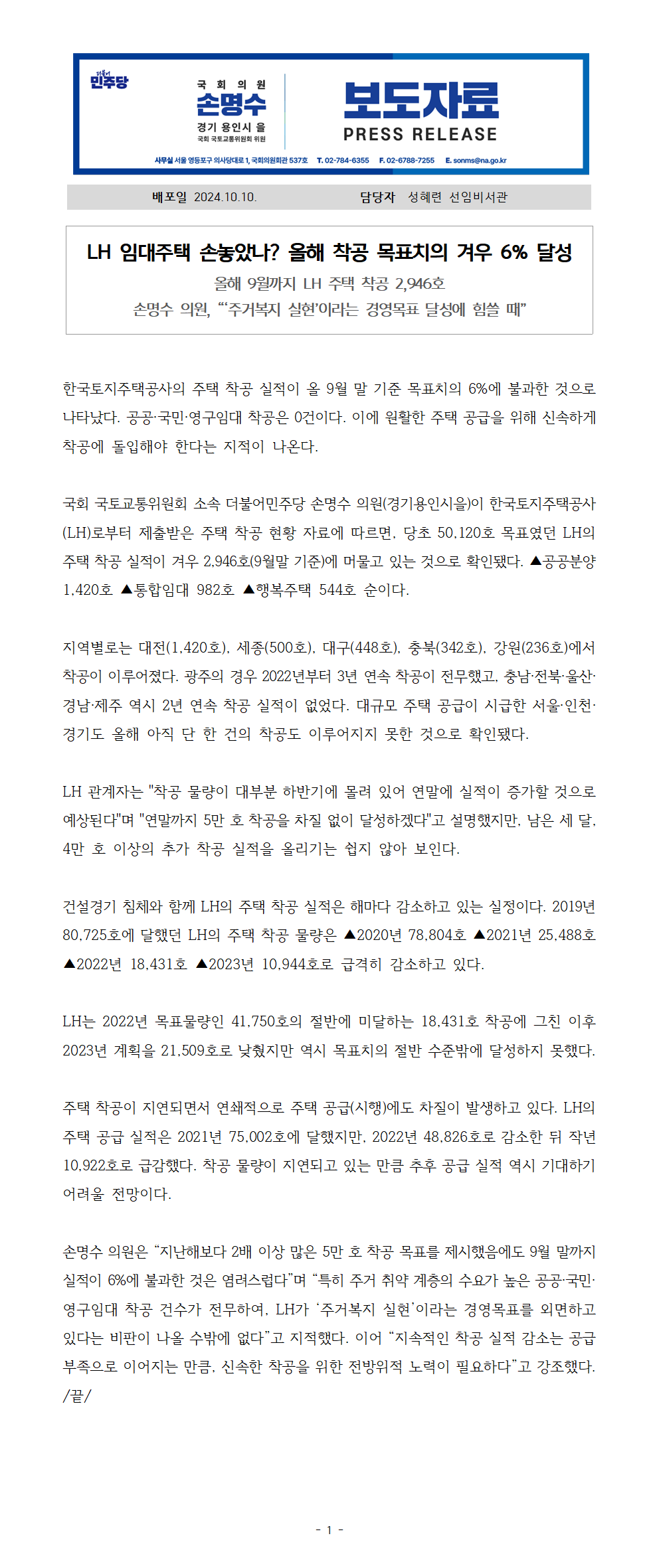 [국회의원 손명수] LH 임대주택 손놓았나? 올해 착공 목표치의 겨우 6% 달성