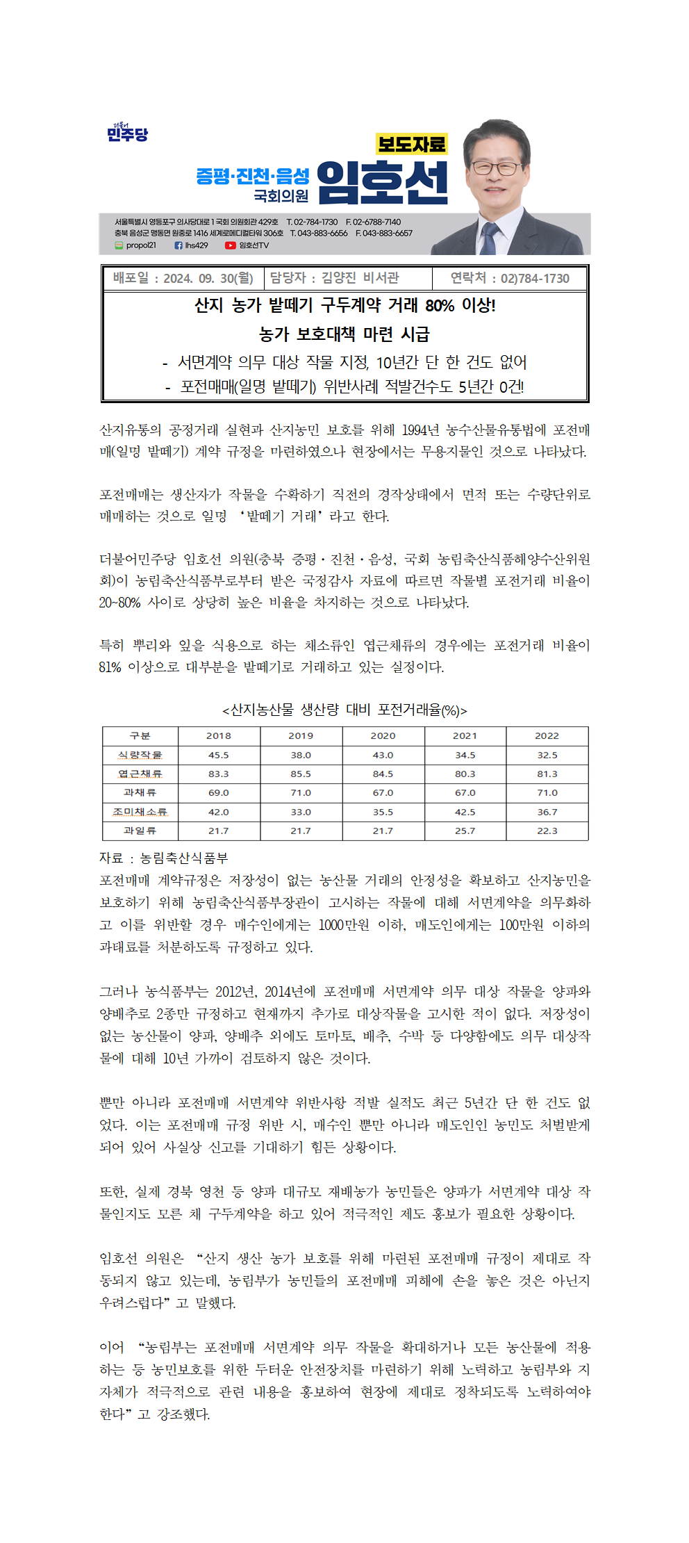 [국회의원 임호선] 산지 농가 밭떼기 구두계약 거래 80% 이상! 농가 보호대책 마련 시급