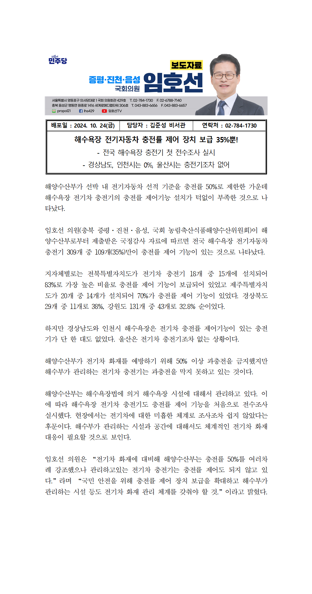 [국회의원 임호선] 해수욕장 전기자동차 충전률 제어 장치 보급 35%뿐!