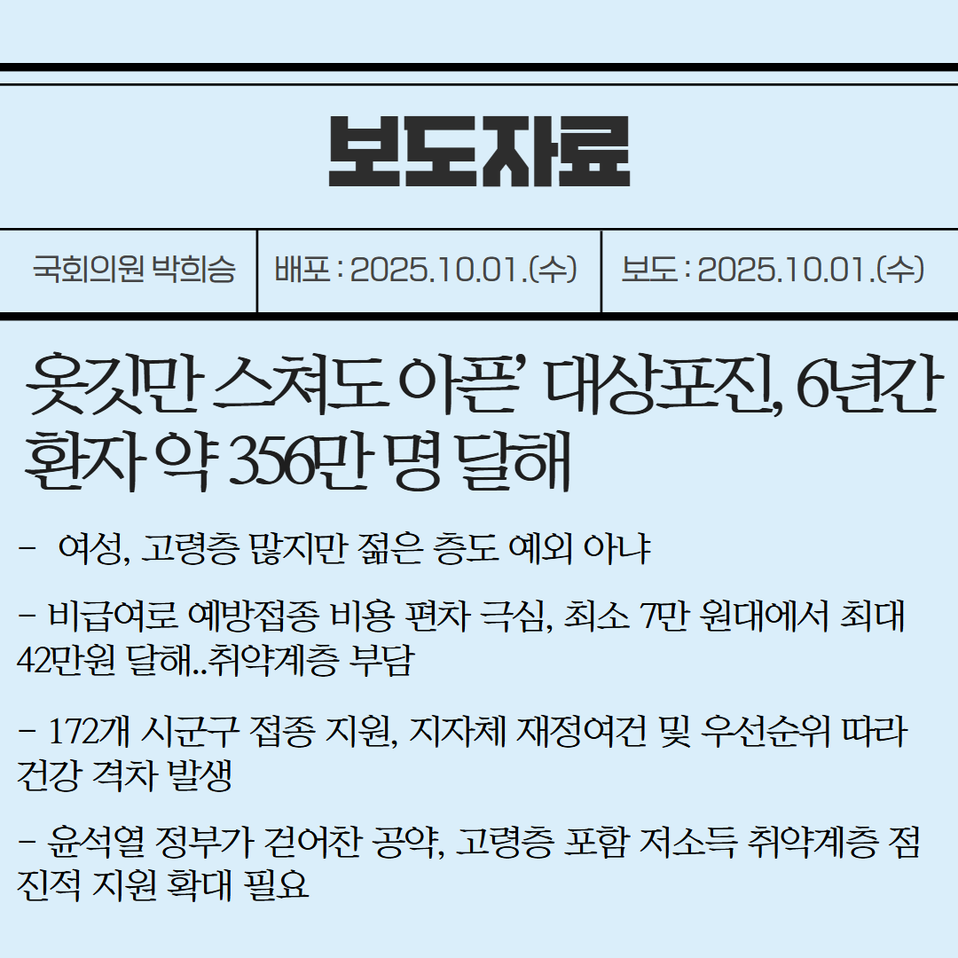 [국회의원 박희승 보도자료] 옷깃만 스쳐도 아픈’ 대상포진, 6년간 환자 약 356만 명 달해